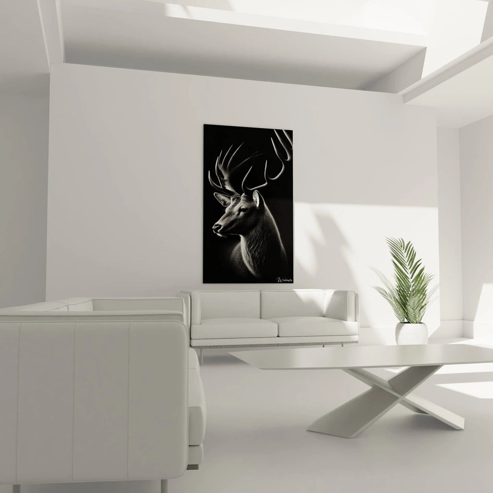 Le jeu subtil d’ombres et de lumières dessine des contours précis où les bois du cerf s’étendent avec grâce, semblables à des branches s’élevant vers l’infini. Cette profondeur crée un univers sensoriel unique, où chaque détail vous invite à plonger dans un calme introspectif, loin de l’agitation du quotidien.