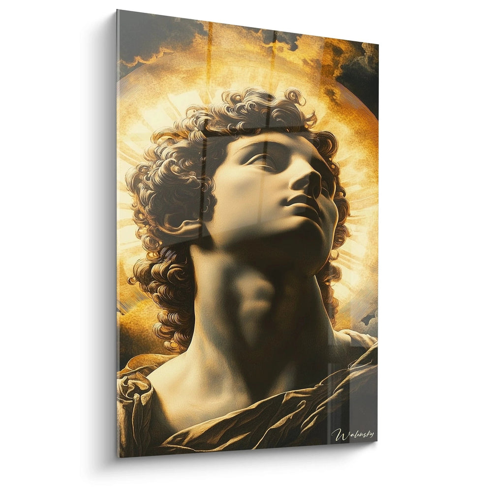 Conçu avec un raffinement remarquable, ce tableau capte la puissance rayonnante d’Apollon : sa chevelure éclatante et son regard tourné vers les cieux suggèrent une harmonie parfaite entre le terrestre et le divin. Chaque détail évoque la sculpture grecque antique, symbole ultime de beauté et d’équilibre. La luminosité incarnée par des nuances d’or, beige et noir apporte une profondeur lumineuse et une élégance rare à votre pièce.