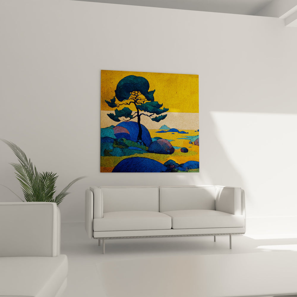 Ce tableau mural paysage présente une composition saisissante d'un arbre stylisé se dressant majestueusement contre un ciel doré éclatant. L'œuvre capture l'essence d'un coucher de soleil paisible avec une technique picturale rappelant les grands maîtres post-impressionnistes. L'arbre, élément central de cette toile décorative nature, déploie ses branches aux formes organiques et ondulantes, créant un contraste harmonieux avec les tons chauds du fond. Les rochers bleus au premier plan ancrent la composition dans un paysage rocheux méditerranéen, tandis que les reflets dorés sur l'eau suggèrent la présence d'une étendue marine. Cette peinture moderne paysage combine habilement les couleurs complémentaires - le bleu profond des rochers et de la végétation contre les jaunes et oranges lumineux du ciel. Les coups de pinceau visibles et la texture riche confèrent à ce tableau artistique nature une dimension tactile qui invite à la contemplation. L'horizon parsemé d'îlots rocheux ajoute une profondeur perspective remarquable à cette œuvre d'art murale exceptionnelle.