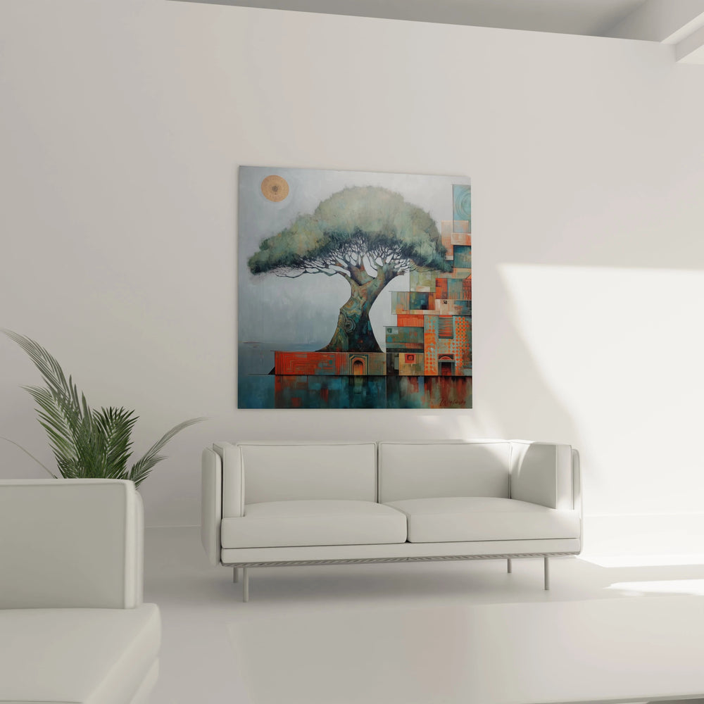 Ce tableau arbre contemporain présente une composition saisissante où la nature rencontre l'architecture moderne. L'œuvre révèle un arbre majestueux aux branches étendues, dominant une structure géométrique colorée qui évoque un habitat contemporain. Le tableau arbre aux motifs géométriques déploie une palette chromatique riche mêlant les tons ocre, turquoise et orange. Les reflets dans l'eau en bas de la composition créent un effet miroir captivant qui amplifie la profondeur visuelle. Cette décoration murale arbre moderne se distingue par son approche unique fusionnant éléments naturels et design contemporain.
