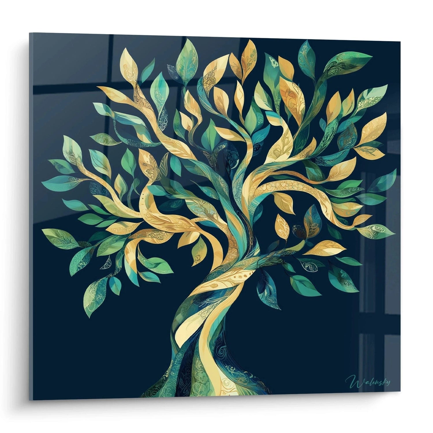 Ce tableau arbre de vie se distingue par sa composition florale sophistiquée où dominent les nuances de vert émeraude et d'or lumineux. L'œuvre présente un arbre stylisé dont le tronc sinueux s'élève en spirales gracieuses, orné de motifs décoratifs délicats. Les branches s'épanouissent en un feuillage luxuriant composé de feuilles aux formes élégantes, certaines parées de dorures scintillantes. Ce tableau arbre de vie contemporain déploie une harmonie visuelle remarquable où chaque élément végétal semble danser dans un mouvement perpétuel. La richesse des détails ornementaux confère à cette décoration murale arbre une profondeur captivante qui attire immédiatement le regard.