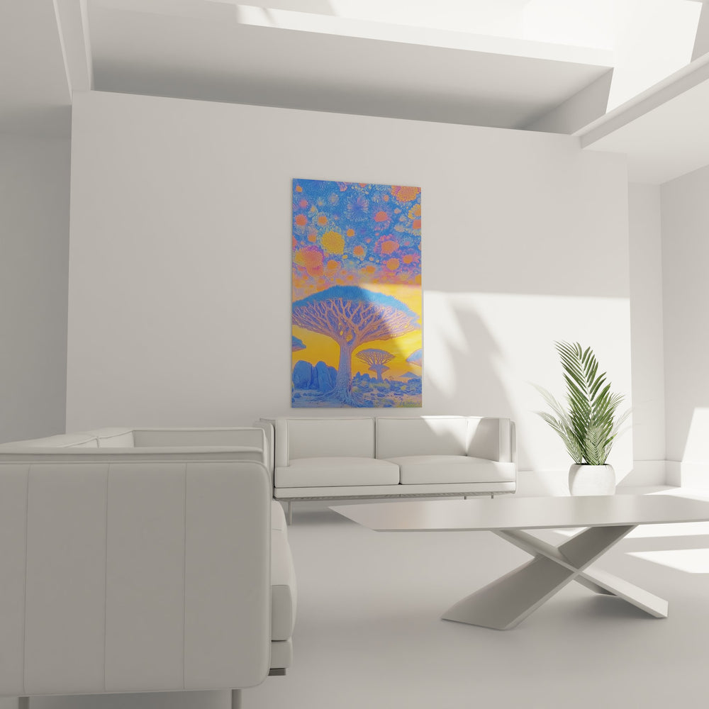 Ce tableau mural arbre tropical présente une vision artistique saisissante d'un paysage de savane africaine sublimé par des éléments fantastiques. Au centre de la composition trône un arbre parasol géant aux branches délicatement ciselées, dont la silhouette majestueuse évoque les iconiques acacias de la savane. Le tronc de l'arbre, rendu dans des tons bleu-violet profonds, contraste harmonieusement avec le ciel orange doré qui illumine l'arrière-plan. Cette œuvre d'art murale africaine intègre avec subtilité des éléphants stylisés en silhouettes bleues, positionnés à la base de l'arbre principal, créant une scène pastorale empreinte de sérénité. Le tableau décoratif savane se distingue par son traitement artistique unique du paysage, où des arbres secondaires ponctuent l'horizon lointain, ajoutant de la profondeur à la composition. La technique picturale révèle des détails minutieux dans le rendu de l'écorce et des ramifications, tandis que le sol présente des nuances subtiles allant du bleu au vert tendre. Cette peinture murale tropicale transforme l'espace de vie en fenêtre ouverte sur un monde où la nature africaine rencontre l'imaginaire artistique. Les couleurs chaudes et froides s'équilibrent parfaitement pour créer une atmosphère à la fois apaisante et dynamique, caractéristique des tableaux paysage exotique contemporain.