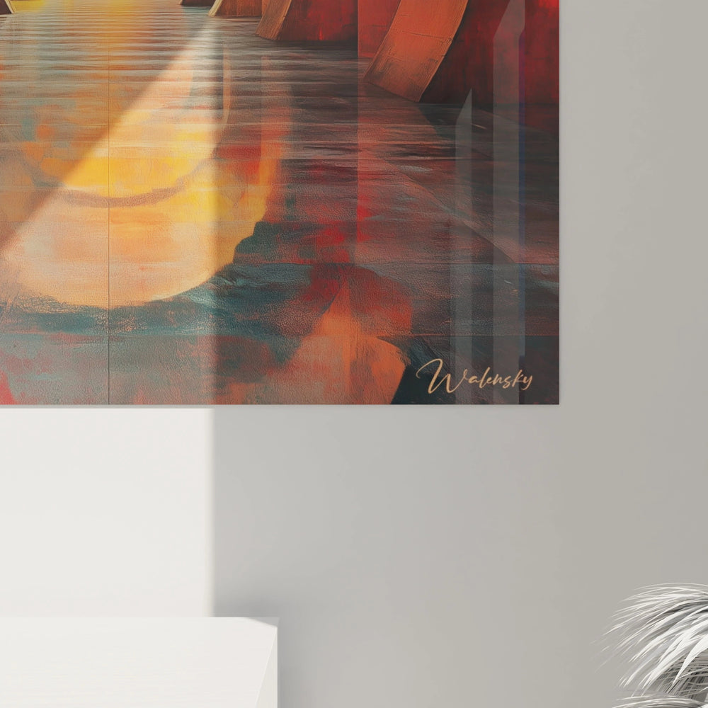 Cette décoration murale tunnel s'épanouit particulièrement dans un environnement contemporain aux lignes épurées. Un éclairage indirect met en valeur les nuances chaudes sans créer de reflets parasites. L'œuvre s'harmonise parfaitement avec des tons neutres comme le blanc, le beige ou le gris anthracite qui font ressortir ses couleurs vives. Cette art mural tunnel décoratif trouve sa place idéale face à un canapé ou dans un couloir où son effet de profondeur peut s'exprimer pleinement, créant une ouverture visuelle spectaculaire dans l'espace.