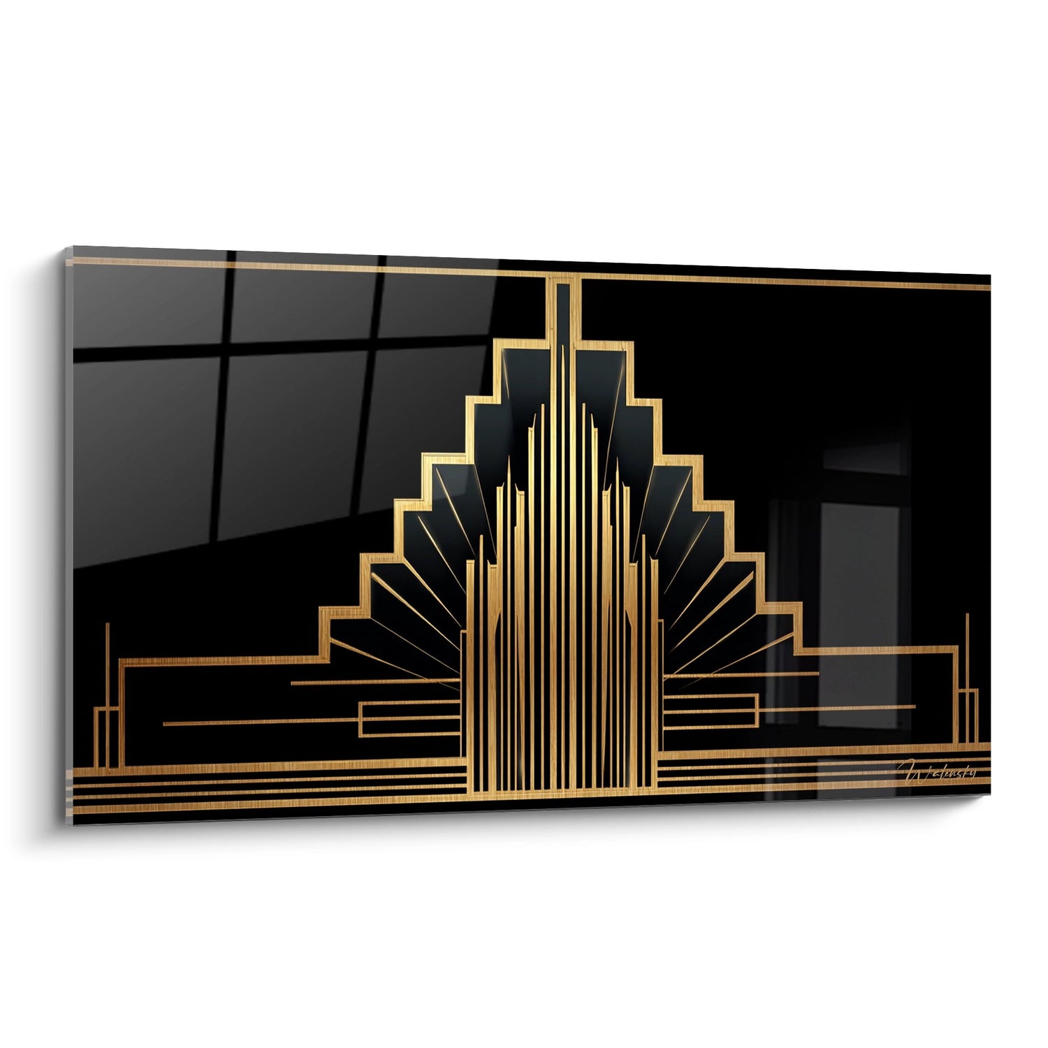 Ce magnifique tableau art déco présente une composition architecturale saisissante aux accents dorés sur un fond noir profond. L'œuvre capture parfaitement l'essence du mouvement Art déco avec ses lignes géométriques élancées et sa structure en éventail caractéristique. Au centre, un élément architectural s'élève majestueusement, évoquant les gratte-ciels emblématiques des années 1920-1930. Les détails dorés créent un contraste luxueux avec le fond sombre, apportant une dimension précieuse à l'ensemble. Cette pièce murale incarne l'élégance et la modernité de l'époque Art déco, avec ses motifs répétitifs et sa symétrie parfaite. Les lignes horizontales et verticales s'entremêlent harmonieusement, créant un rythme visuel captivant. L'utilisation du noir et de l'or confère une sophistication intemporelle à cette œuvre, parfaite pour sublimer un intérieur contemporain ou classique.