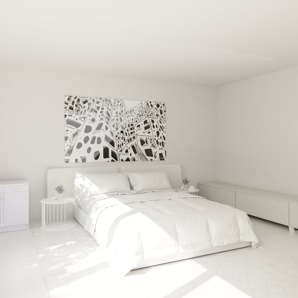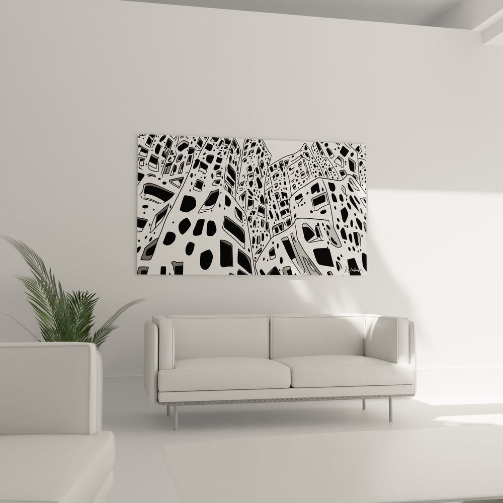 Ce tableau déploie un contraste saisissant entre un noir profond et un blanc éclatant, créant une ambiance à la fois énergisante et apaisante. En l’accrochant à votre mur, vous invitez une présence graphique puissante qui dynamise votre intérieur sans l’alourdir. Chaque tache et chaque trait composent un puzzle harmonieux, évoquant le rythme effervescent des villes contemporaines tout en offrant une pause contemplative.