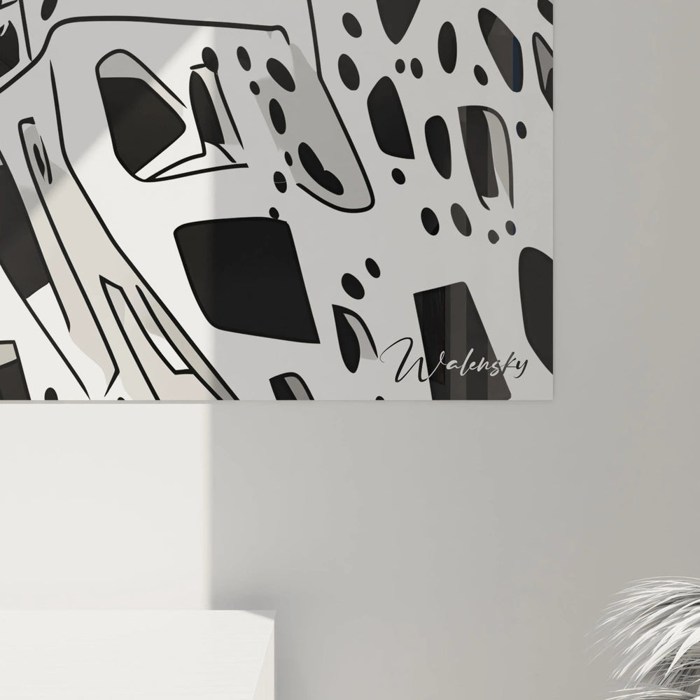 L'analyse révèle une surface lisse aux contrastes nets qui suggère une technique graphique précise et maîtrisée. Les transitions entre noir et blanc s'effectuent par des délimitations franches sans bavures ni dégradés involontaires. Cette art mural technique graphique moderne présente une exécution impeccable qui met en valeur chaque détail de la composition. Les effets de lumière virtuelle créent une impression de volume malgré la bidimensionnalité du support. Les zones tachetées révèlent une régularité organisée qui évoque un travail digital ou sérigraphique de haute précision technique.