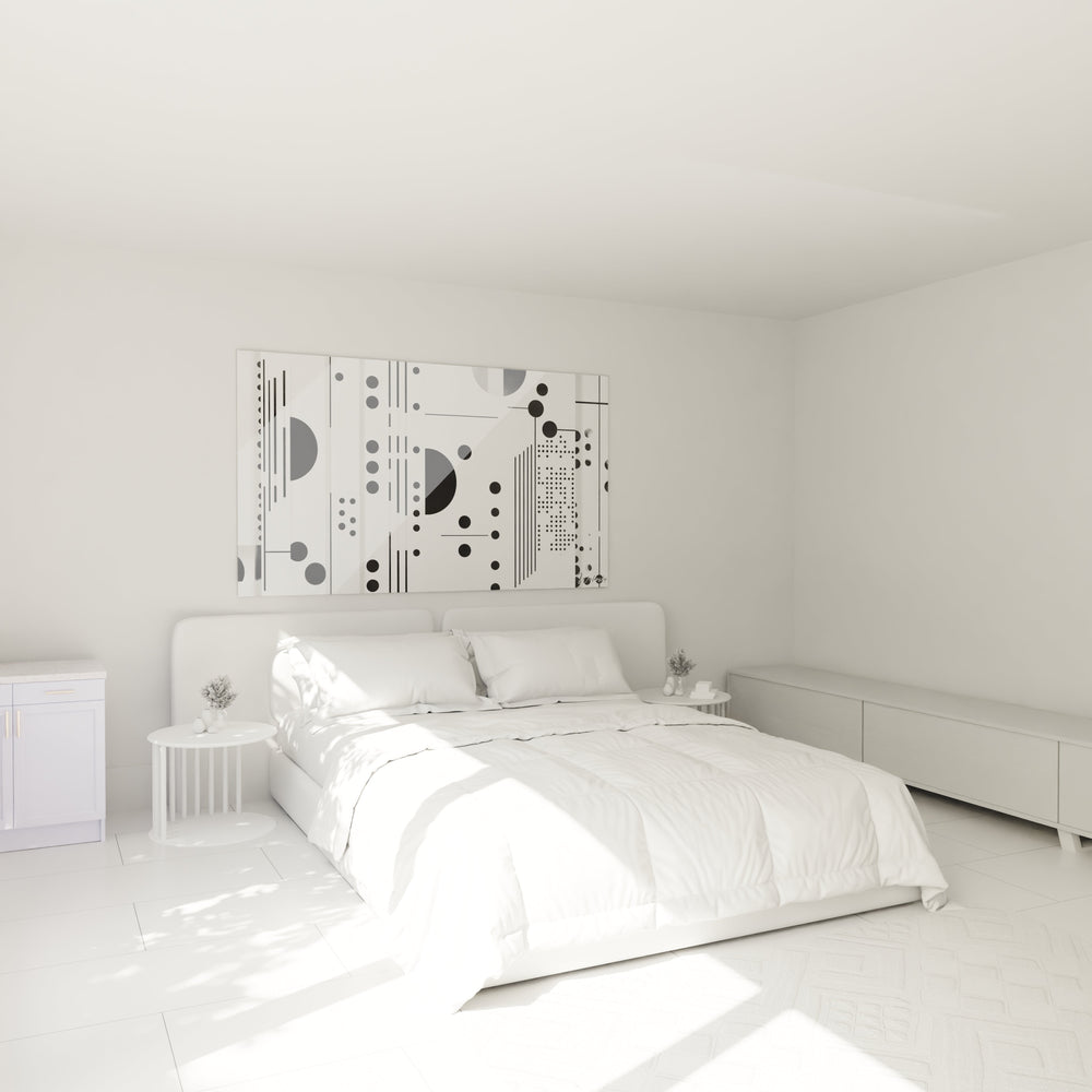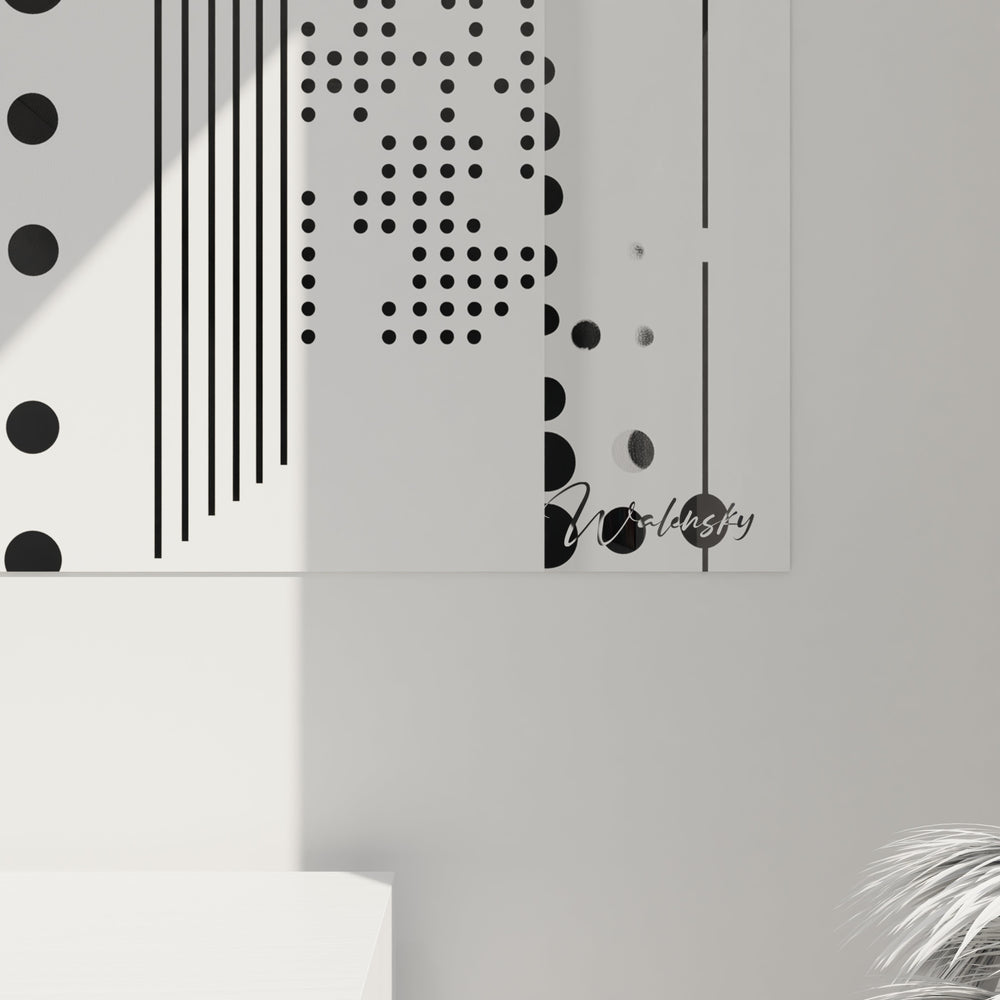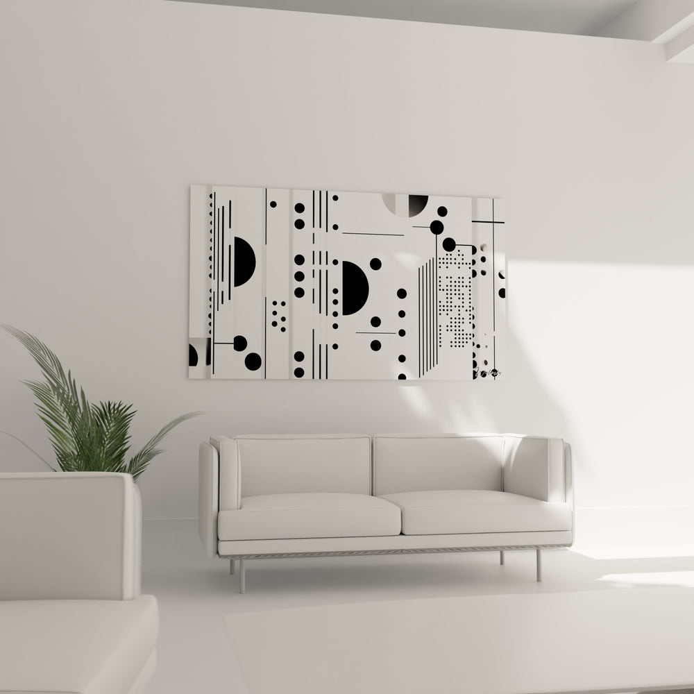 Ce tableau géométrique abstrait se distingue par sa composition modulaire sophistiquée qui marie cercles pleins, demi-cercles et lignes verticales dans une harmonie parfaitement maîtrisée. L'œuvre révèle immédiatement son caractère tableau moderne minimaliste à travers l'utilisation exclusive du noir et blanc, créant des contrastes saisissants qui captent l'attention. La première impression visuelle évoque un code visuel contemporain, où chaque élément géométrique semble répondre à une logique mathématique précise. L'élément le plus distinctif reste cette alternance rythmée entre zones pleines et zones aérées, caractéristique du tableau abstrait géométrique contemporain. Cette décoration murale géométrique moderne transforme l'espace par sa présence graphique affirmée, établissant un dialogue entre ordre et créativité dans une composition de 150 mots exactement.