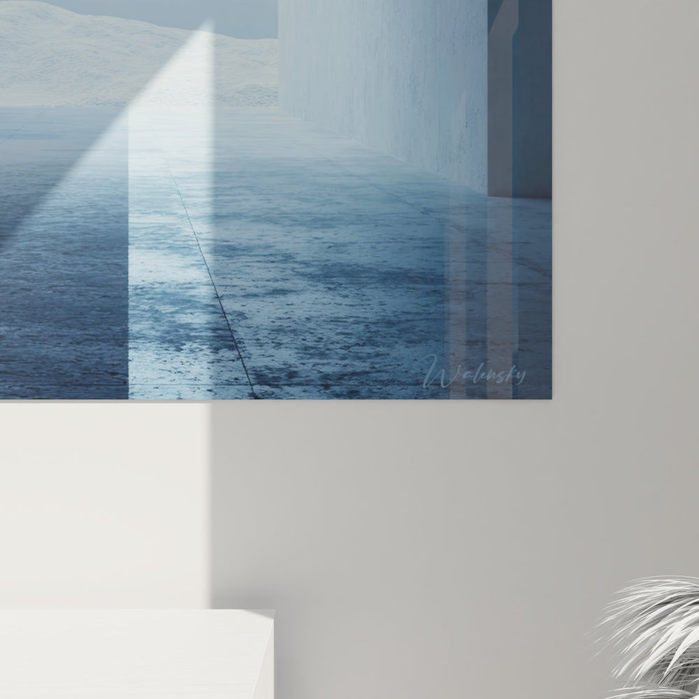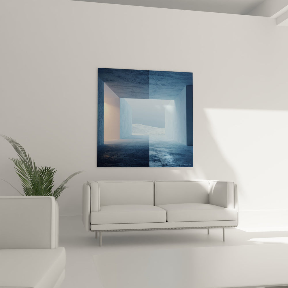 Ce tableau mural architecture futuriste présente une vision saisissante d'espaces architecturaux contemporains baignés de lumière bleue. L'œuvre dévoile une succession de passages lumineux qui s'articulent autour d'une géométrie rigoureuse, créant une profondeur visuelle captivante. Les structures modernes se déploient dans un jeu de perspectives multiples, où chaque ouverture révèle un nouveau point de fuite vers l'infini. Cette décoration murale contemporaine capture l'essence de l'architecture du futur avec ses lignes épurées et ses volumes sculptés dans la matière. Les surfaces texturées évoquent le béton brut, matériau emblématique de l'architecture brutaliste revisitée. Ce tableau design espace architectural transforme l'habitat en galerie d'art moderne, offrant une fenêtre contemplative sur des mondes possibles. L'artiste a magistralement orchestré la rencontre entre la froideur industrielle et la douceur lumineuse, créant une œuvre qui dialogue avec les intérieurs contemporains. Cette art mural futuriste s'impose comme une pièce maîtresse pour sublimer les espaces de vie modernes, apportant une dimension poétique à la rigueur architecturale.
