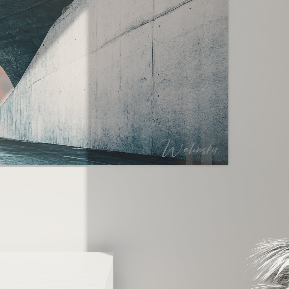 Cette œuvre s'inspire du mouvement brutaliste et de l'architecture moderne de Le Corbusier ou Tadao Ando. Elle évoque également les installations artistiques de James Turrell qui explorent la lumière et l'espace. Ce style architectural minimaliste contemporain trouve ses références dans l'art conceptuel et la photographie d'architecture, créant un pont entre fonctionnalisme et poésie visuelle dans l'art mural moderne.