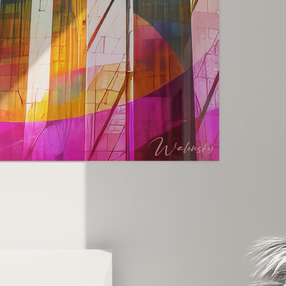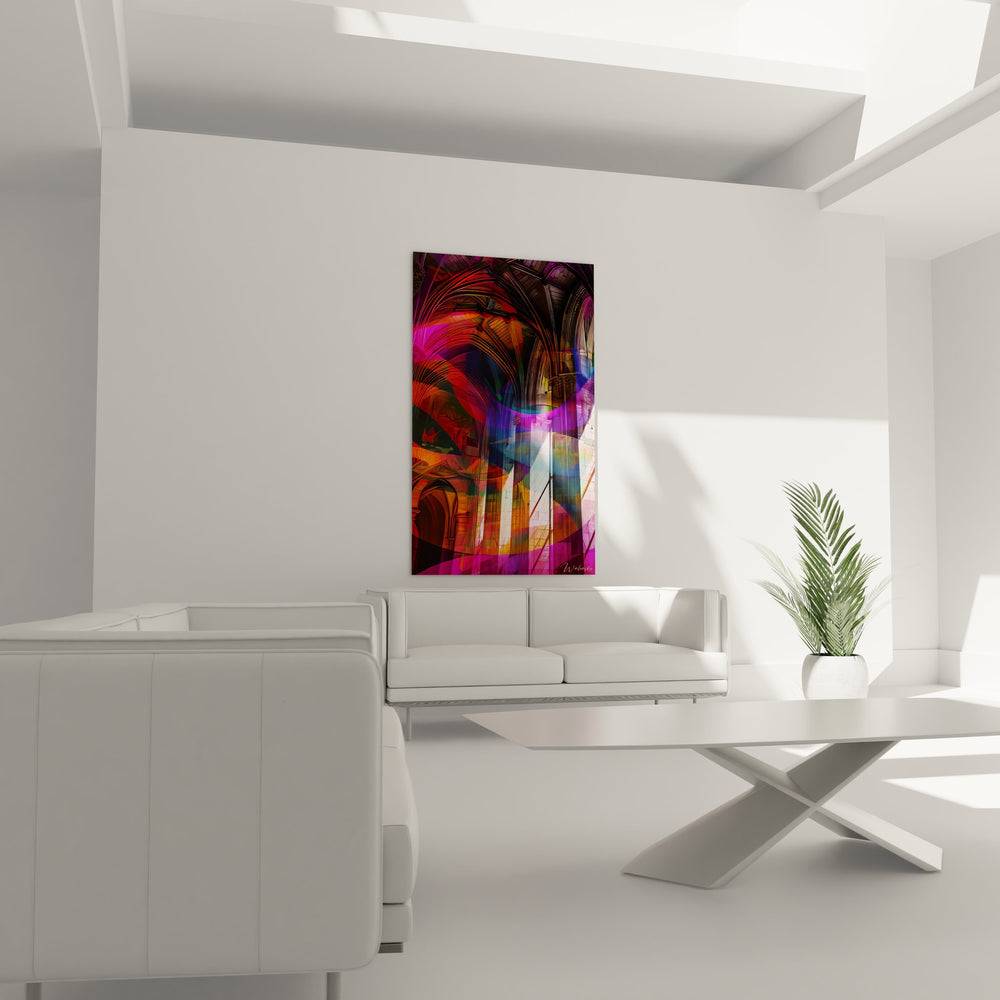 La palette chromatique de ce tableau art gothique moderne oscille entre les roses fuchsia, les oranges lumineux et les violets profonds, créant un contraste saisissant avec l'architecture traditionnellement austère des cathédrales gothiques. Ces couleurs évoquent la transcendance spirituelle et la lumière divine filtrant à travers les vitraux, symboles de l'élévation de l'âme vers le divin dans l'art gothique.