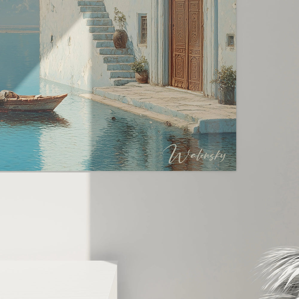 L'expérience visuelle de cette tableau architecture méditerranéenne perspective marine se transforme selon la distance d'observation. À proximité, les détails architecturaux se révèlent dans toute leur sophistication : les motifs gravés sur la porte de bois, les variations subtiles de texture sur les murs blanchis à la chaux, les nuances d'ombre qui sculptent chaque relief. L'examen rapproché dévoile également la finesse du rendu aquatique, où chaque ridule à la surface de l'eau semble vibrer de vie. L'effet global à distance révèle une composition d'une harmonie parfaite, où tous les éléments convergent vers une impression d'équilibre absolu. Cette art mural méditerranéen profondeur crée une sensation d'immersion totale, transportant l'observateur dans cet univers de quiétude éternelle. Les détails techniques ultra-spécifiques, comme les reflets lumineux sur la coque de la barque, témoignent d'une maîtrise artistique exceptionnelle.
