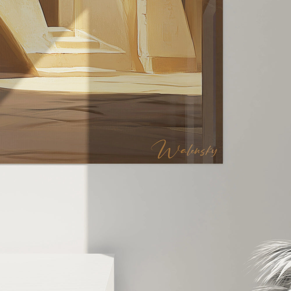 La palette chromatique se concentre sur une gamme chaleureuse dominée par les ocres, les beiges et les dorés lumineux. Ces tonalités créent une atmosphère enveloppante qui évoque la chaleur du soleil sur la pierre ancienne. Ce tableau architecture couleurs chaudes présente des nuances subtiles qui varient du sable clair au brun profond, créant une richesse chromatique remarquable. Les contrastes entre les zones d'ombre fraîche et les surfaces baignées de lumière apportent un dynamisme visuel exceptionnel.