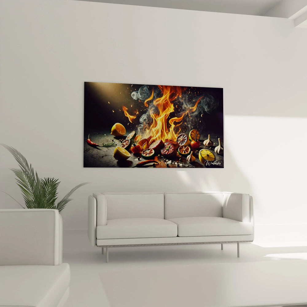Plongez dans une atmosphère où les sens s’enflamment et la créativité s’exprime pleinement grâce au Tableau Arômes Enflammés - Edition Cuisine. Cette œuvre unique capture l’essence même de la cuisine comme un spectacle vivant où le feu danse et les arômes explosent, transformant votre espace en un temple dédié à l’art culinaire.