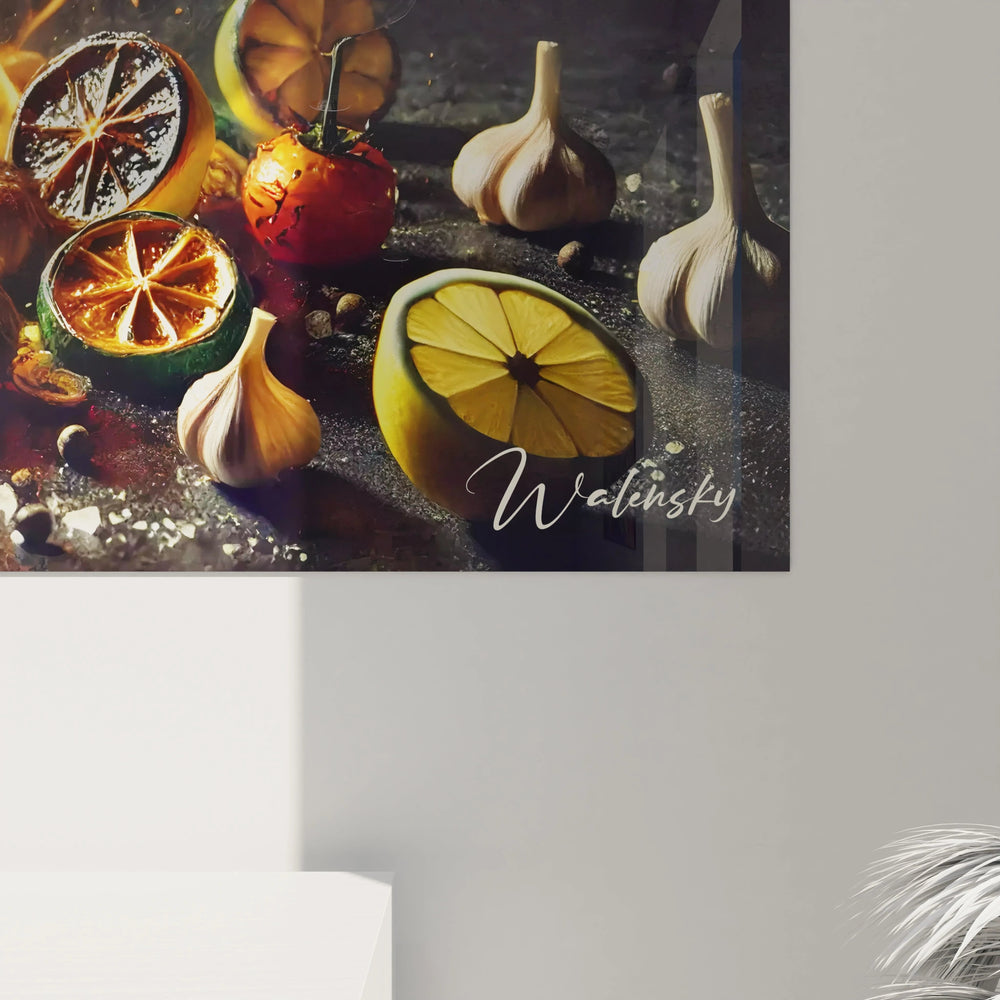 Imaginez la chaleur douce et intense du feu qui crépite, illuminant chaque ingrédient avec une lumière dorée. Le jaune flamboyant, le rouge profond et le vert éclatant des agrumes éveillent une sensation chaleureuse et vibrante, comme si vous étiez au cœur d’une préparation gastronomique en pleine action. Ce tableau ne se contente pas d’habiller vos murs, il insuffle une énergie brute et passionnée, propice à l’inspiration et à l’audace dans votre cuisine.