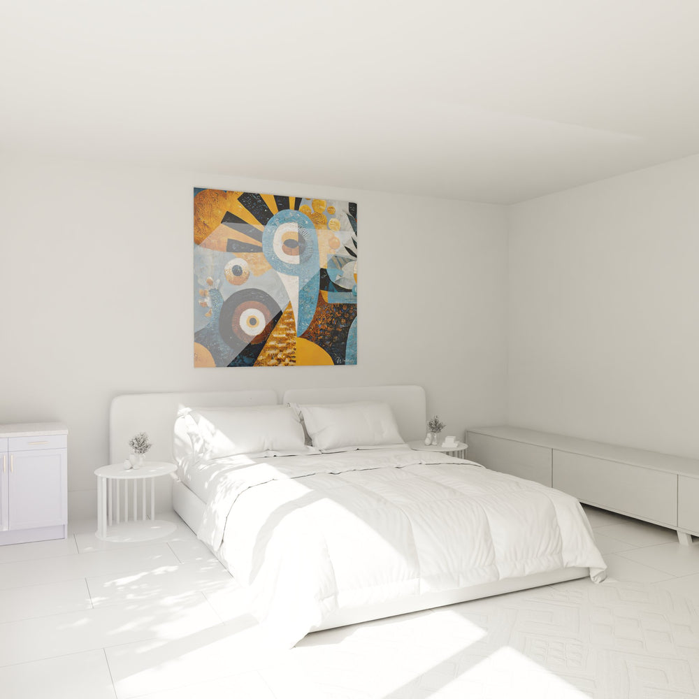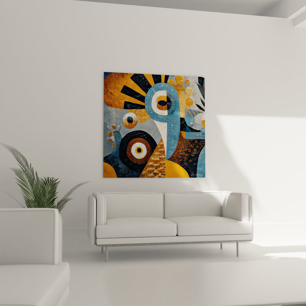Ce tableau mural art abstrait africain présente une composition fascinante mêlant symbolisme cosmique et esthétique contemporaine. L'œuvre révèle une série d'yeux stylisés aux couleurs vibrantes, évoquant la spiritualité et la sagesse ancestrale africaine. Les formes géométriques s'entremêlent dans un ballet visuel où dominent les tons ocre, bleu profond et blanc cassé, créant un contraste saisissant. Ce tableau décoratif culture africaine intègre des motifs circulaires rappelant les masques traditionnels et les symboles sacrés africains. Les textures variées, allant du lisse au granuleux, apportent une dimension tactile à cette œuvre d'art mural moderne. L'artiste a su capturer l'essence de la philosophie africaine traditionnelle en traduisant les concepts de vision intérieure et de connexion cosmique à travers un langage plastique contemporain. Cette peinture abstraite inspiration africaine dialogue entre passé et présent, offrant une lecture multiple où chaque regard découvre de nouveaux détails et significations cachées dans cette composition riche et complexe.