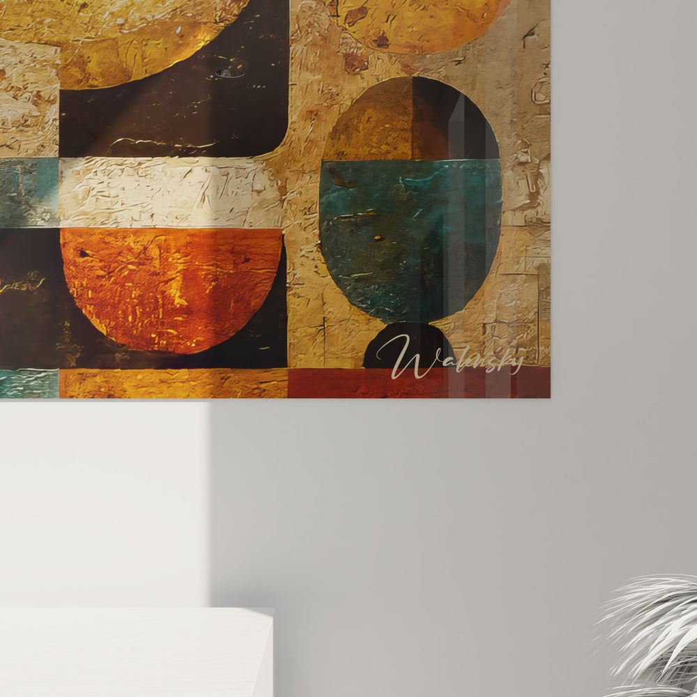 Cette œuvre s'inscrit dans la lignée des maîtres de l'art abstrait africain décoratif, rappelant les créations d'artistes comme El Anatsui ou Ibrahim El-Salahi. La technique de fragmentation géométrique fait écho aux masques traditionnels Dogon tout en adoptant une approche résolument moderne. Cette peinture murale style africain dialogue avec les mouvements artistiques contemporains africains qui réinterprètent les codes ancestraux dans un langage visuel actuel.