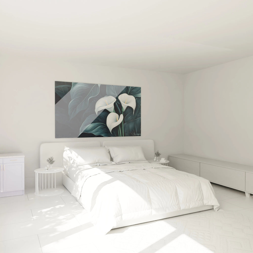 Ce tableau met en lumiĂšre la dĂ©licatesse majestueuse de lâarum, une fleur reconnue pour ses lignes pures et sa prĂ©sence apaisante. EnveloppĂ© par un feuillage vert profond, chaque pĂ©tale blanc Ă©claire la piĂšce dâune lumiĂšre douce et naturelle. Cette composition rĂ©aliste et soignĂ©e crĂ©e un Ă©quilibre parfait entre simplicitĂ© et sophistication, insufflant Ă votre intĂ©rieur une atmosphĂšre calme et harmonieuse.