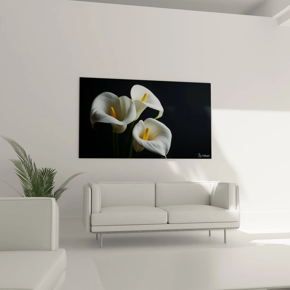 Imaginez-vous face Ă cette crĂ©ation oĂč la blancheur immaculĂ©e des pĂ©tales sâillumine dĂ©licatement sur un fond noir profond, crĂ©ant un contraste saisissant qui attire le regard. Chaque dĂ©tail, du galbe soyeux des fleurs au jaune Ă©clatant du pistil, a Ă©tĂ© pensĂ© pour Ă©veiller vos sens et instaurer une atmosphĂšre dâapaisement et de mystĂšre dans votre espace.
