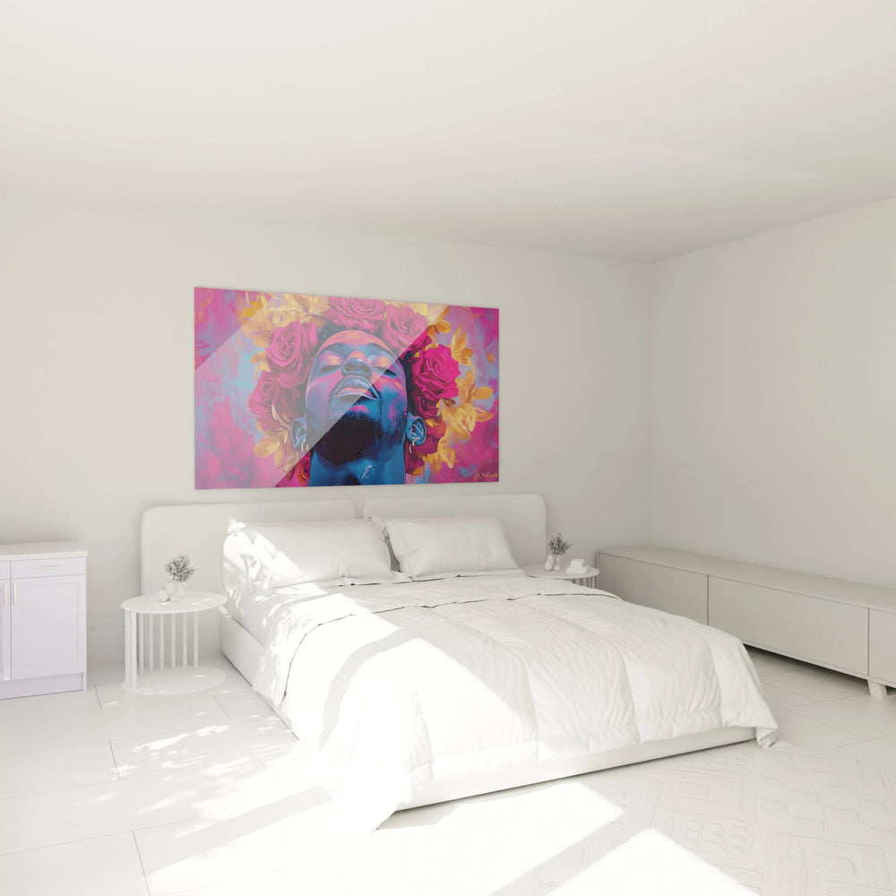 Le bleu profond de la peau contraste avec l’éclat rose des roses qui composent une aura lumineuse et presque sacrée. Vous pouvez presque sentir la texture des pétales et la douceur du visage, comme si vous étiez témoin d’un moment suspendu entre rêve et réalité. Ces tonalités soigneusement choisies réveillent l’espace, insufflant à votre pièce une énergie à la fois apaisante et revigorante.