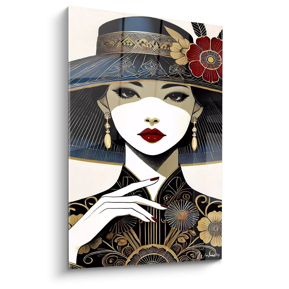 Cette représentation délicate met en scène une femme à l’allure captivante, dont le regard énigmatique attire immédiatement l’attention. Ses lèvres d’un rouge profond contrastent avec un fond noir intensément profond, tandis que des accents dorés viennent magnifier les motifs floraux qui ornent sa silhouette. Cette alliance subtile des couleurs crée une atmosphère d’élégance rare, qui s’harmonise parfaitement avec un intérieur recherché.