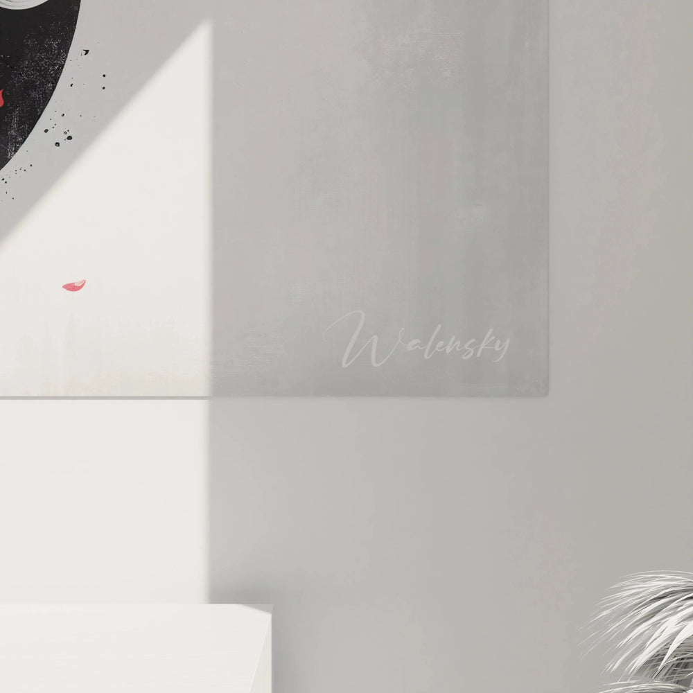 Chaque regard pose sur ce tableau est une invitation à prendre une pause, à ressentir cette paix intérieure qui souvent nous échappe dans le tumulte quotidien. La texture légère du fond et les contrastes élégants en noir, blanc et rouge créent une ambiance à la fois contemporaine et intemporelle, idéale pour un lieu où règne le calme.