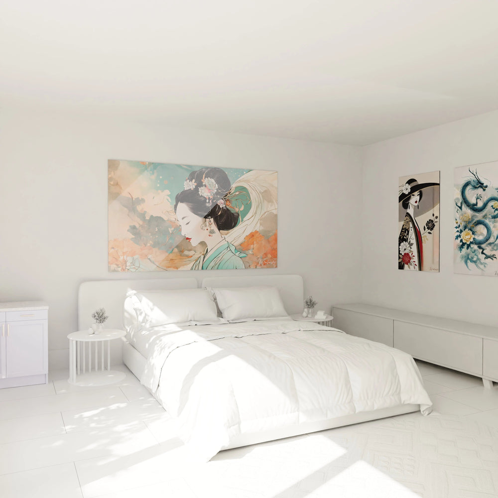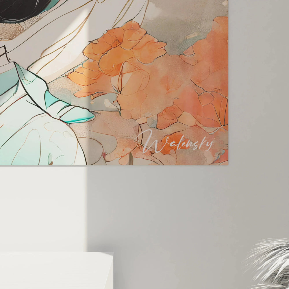 Les teintes choisies – nuances de bleu-vert, touches délicates de rose et accents chaleureux de beige – créent une harmonie visuelle qui invite à la contemplation. La fusion de ces couleurs enveloppe la pièce d’une ambiance paisible, tout en mettant en lumière la beauté raffinée de la silhouette centrale. Vous retrouvez à chaque regard une sensation de douceur presque tactile, donnant vie à l’intimité de cet instant figé.