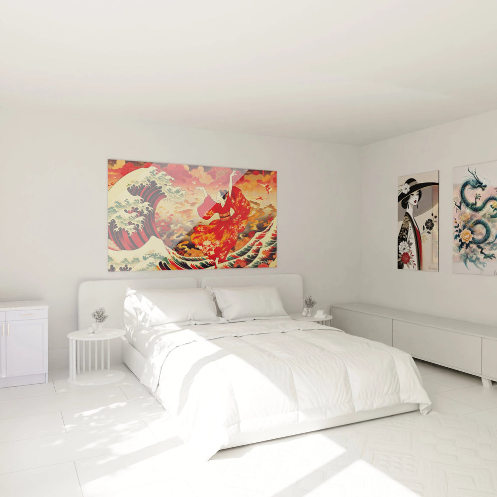 Plongez-vous dans une expérience visuelle et émotionnelle unique avec le Tableau Valse en Rouge - Édition Asia. Cette œuvre d’exception capture la magie d’un instant où la puissance sauvage de la nature rencontre la grâce raffinée de la culture asiatique. Imaginez une danseuse vêtue d’un somptueux kimono rouge virevoltant au rythme d’une vague majestueuse, évoquant tour à tour la sérénité et la force indomptable.