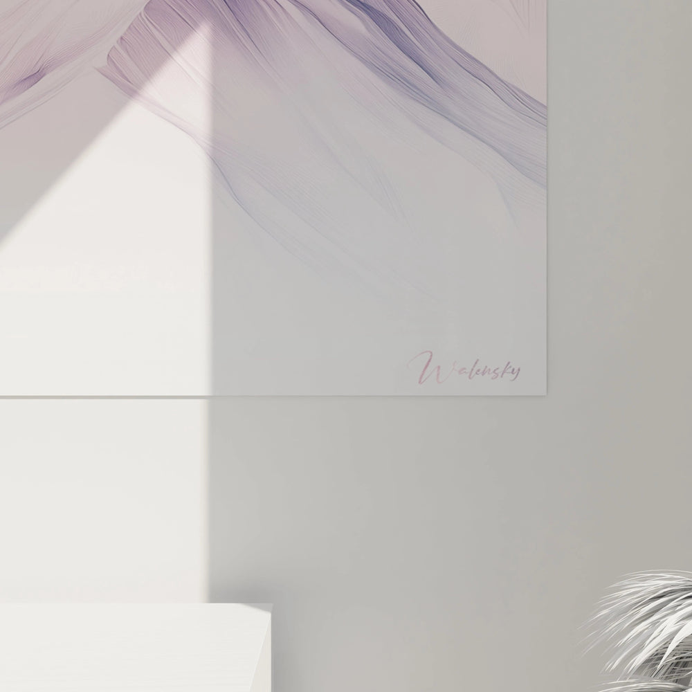 L'unicité de cette décoration murale montagne réside dans sa capacité à capturer l'essence majestueuse des montagnes tout en les transformant en une vision presque onirique. Le traitement minimaliste, loin d'appauvrir le sujet, lui confère une dimension poétique. La signature de l'artiste, discrètement apposée, témoigne de l'authenticité de l'œuvre. Les dégradés exceptionnellement subtils entre les teintes roses et violettes créent une atmosphère paisible impossible à reproduire, faisant de cette œuvre montagne un élément décoratif unique et méditatif.
