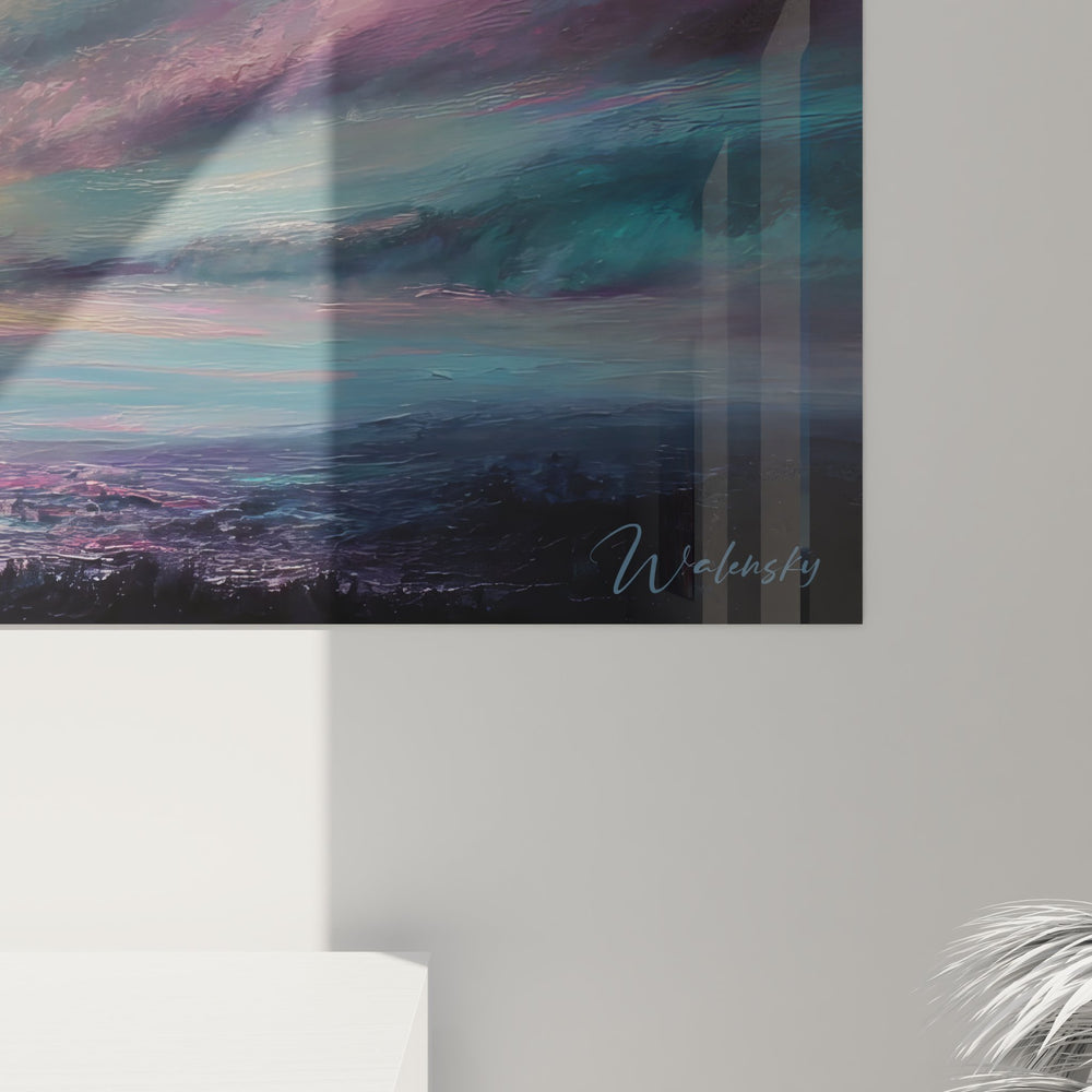 La palette chromatique de ce tableau aurore boréale évoque la sérénité et l'émerveillement. Les tons violets symbolisent la spiritualité et la transformation, tandis que les verts représentent l'harmonie avec la nature. Les nuances roses apportent une douceur réconfortante, créant une atmosphère propice à la méditation et à l'évasion mentale dans cet univers de lumières nordiques artistiques.