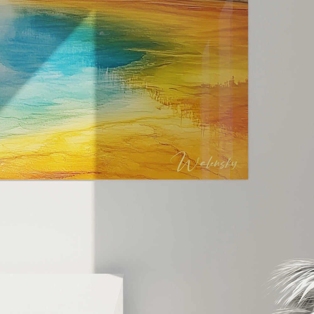 Cette art mural source thermale s'intègrera harmonieusement dans des espaces de vie contemporains, apportant une touche de nature spectaculaire et une énergie positive. Elle trouvera également sa place dans des environnements professionnels recherchant une ambiance apaisante mais inspirante, comme des espaces de bien-être, des bureaux créatifs ou des lieux d'accueil haut de gamme. Pour une mise en valeur optimale, évitez de surcharger l'espace environnant avec d'autres éléments colorés qui entreraient en compétition visuelle avec les teintes vibrantes du tableau.