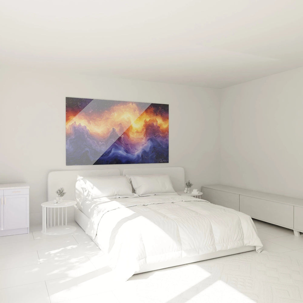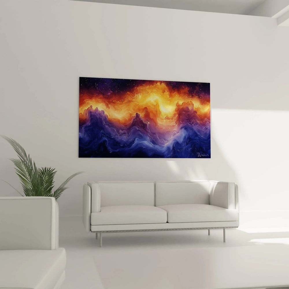 Ce tableau nuages cosmiques révèle une composition extraordinaire où les éléments célestes se mélangent dans une danse visuelle captivante. L'œuvre présente une symphonie de formations nuageuses qui évoquent un paysage cosmique en mouvement perpétuel. Les tableau nuages flamboyants orange dominent la partie supérieure, créant un contraste saisissant avec les masses violettes qui ancrent la composition. Cette décoration murale nuages abstraits capture l'essence même d'un ciel en transformation, où chaque volute semble animée d'une énergie propre. L'intensité dramatique de l'ensemble évoque un sentiment de sublime naturel, transportant l'observateur dans un univers où réalité et imagination se confondent harmonieusement.