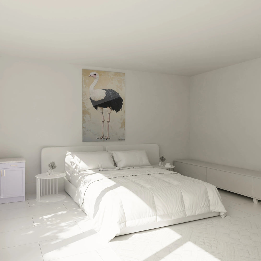 Le traitement minimaliste du fond, délibérément neutre et texturé, est un choix artistique qui renforce l'impact visuel du sujet. Cette approche contemporaine fait de ce tableau autruche décoratif une pièce intemporelle qui s'intègre harmonieusement dans des intérieurs modernes tout en conservant une forte présence artistique. L'équilibre parfait entre réalisme détaillé et composition épurée distingue cette œuvre parmi les représentations d'autruches dans l'art contemporain.