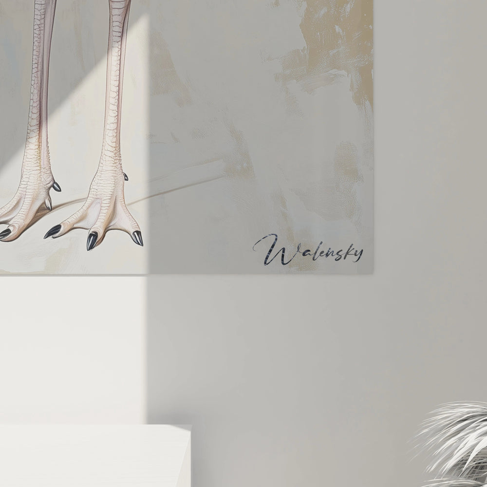 La finesse du rendu des détails anatomiques, comme les écailles des pattes ou les subtiles nuances rosées autour des yeux de l'autruche, témoigne d'une observation minutieuse et d'une technique picturale maîtrisée qui font de cette art mural autruche une œuvre d'exception.