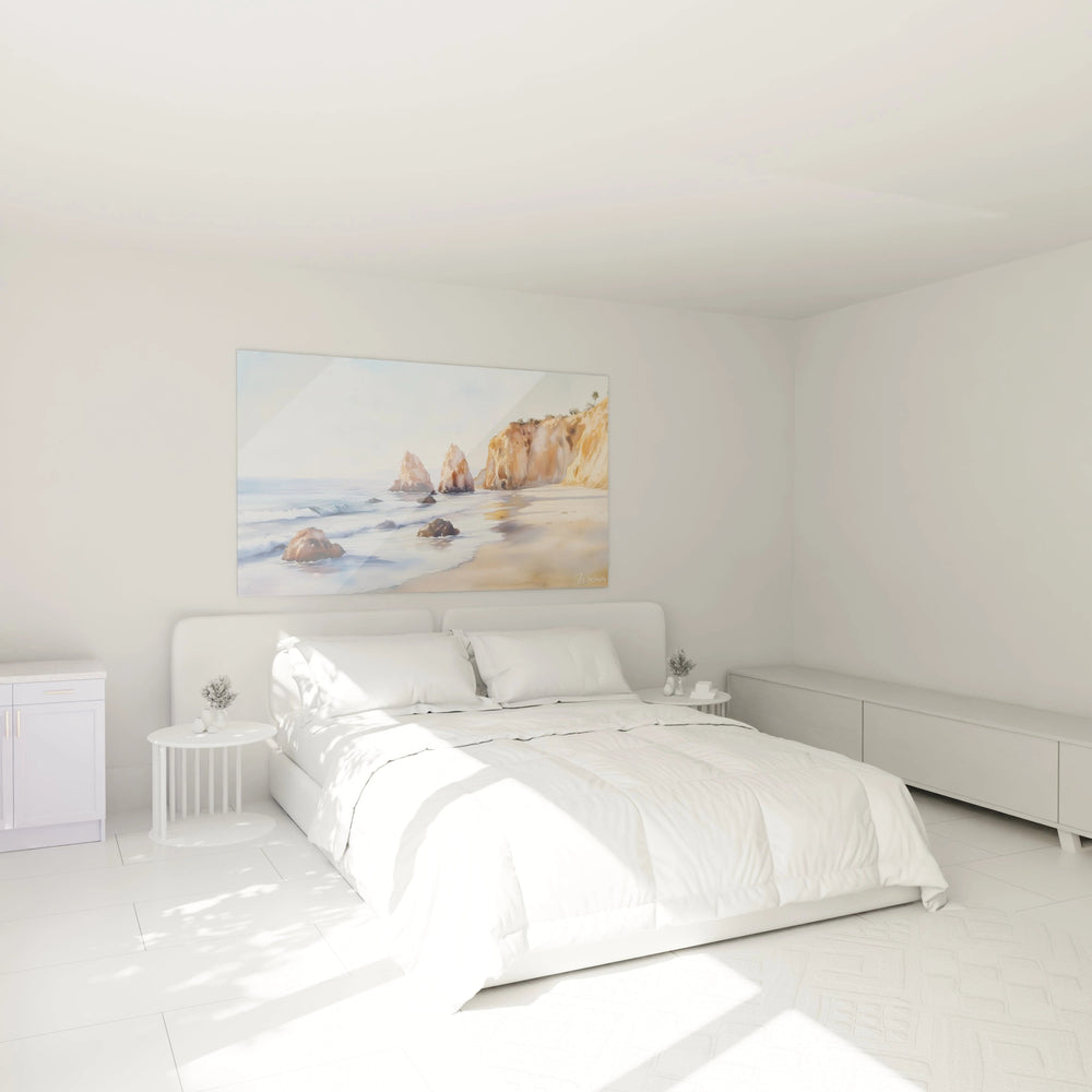 À distance, ce tableau plage offre une vue d'ensemble harmonieuse qui évoque immédiatement la sérénité d'un paysage côtier. En s'approchant, l'observateur découvre une multitude de détails subtils : les variations de texture dans les falaises, les nuances dans l'écume des vagues, et les gradations délicates de couleur dans le ciel. Ce tableau plage panorama océanique révèle progressivement sa complexité, avec des éléments qui n'apparaissent qu'à l'examen rapproché, comme les petits rochers dans l'eau ou les variations de teinte dans le sable. Cette richesse de détails fait de cette décoration murale plage californienne une œuvre qui ne cesse de surprendre et d'émerveiller.