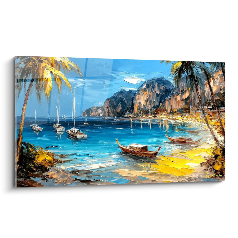 Tags : baie tropicale, voiliers méditerranéens, palmiers dorés, peinture marine, paysage côtier