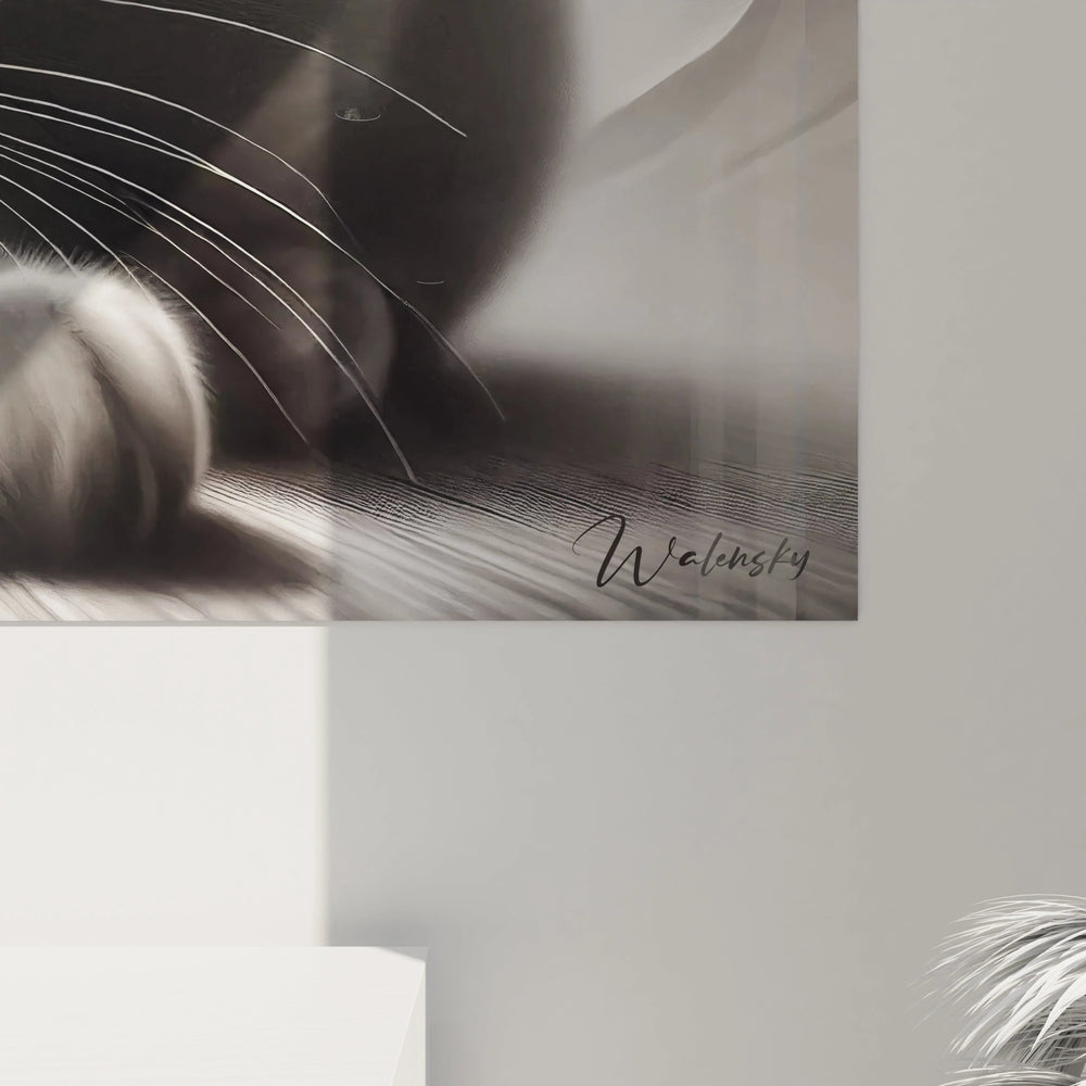 Laissez-vous emporter par la délicatesse des textures travaillées avec finesse, où chaque détail du pelage subtil du chat se mêle à la transparence délicate des ailes du papillon. Les tonalités raffinées de gris et de noir créent un contraste élégant, mettant en lumière l’éclat vibrant du rouge – un jeu de couleurs soigneusement harmonisé pour attirer votre regard et éveiller vos émotions.
