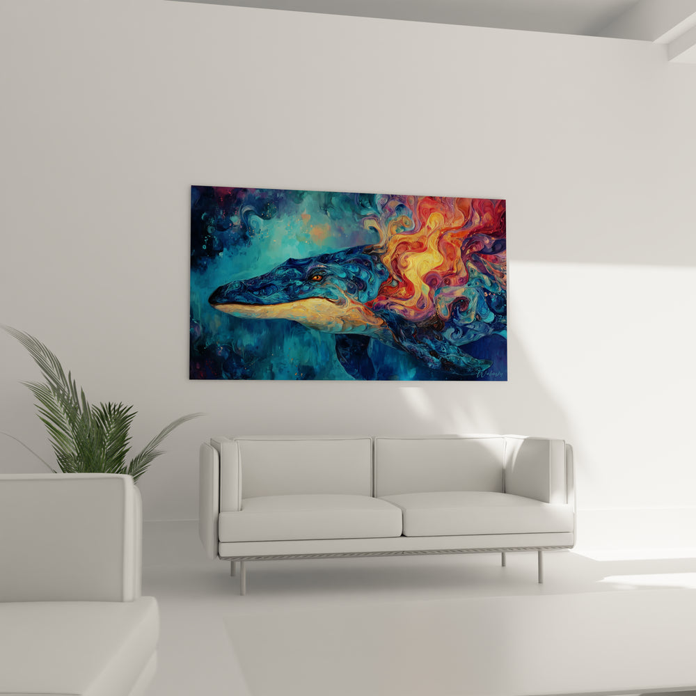Ce tableau baleine abstraite présente une représentation saisissante d'un cétacé dans un style artistique contemporain. L'œuvre révèle une baleine stylisée aux formes fluides, dont le corps serpentine dans un océan de couleurs vibrantes. La créature marine émerge des profondeurs turquoise, sa silhouette majestueuse se dessinant avec une précision artistique remarquable. Le tableau mural baleine capture l'essence mystique de ces géants des mers à travers un prisme artistique innovant. L'animal marin semble exhaler un souffle cosmique, transformant l'acte naturel de respiration en une explosion de couleurs flamboyantes. Cette décoration murale baleine transcende la simple représentation animalière pour devenir une méditation visuelle sur la puissance de la nature. Les détails anatomiques sont stylisés avec finesse, révélant l'œil perçant de la baleine qui semble observer le spectateur. Cette toile baleine contemporaine s'inscrit dans une démarche artistique moderne où la faune marine devient prétexte à une exploration chromatique audacieuse. L'artiste a su capturer la grâce naturelle de ces mammifères marins tout en y insufflant une dimension onirique et poétique.