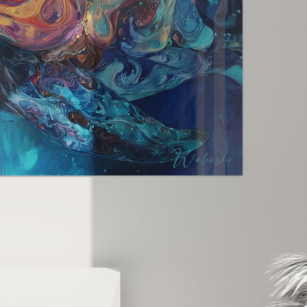 La palette chromatique de ce tableau baleine coloré oscille entre les bleus profonds évoquant les abysses océaniques et les oranges flamboyants symbolisant la vitalité. Cette art mural baleine révèle une symbolique riche où l'animal représente la sagesse ancestrale et la connexion spirituelle avec les éléments naturels. Les couleurs chaudes contrastent harmonieusement avec les tons froids, créant un équilibre visuel captivant.
