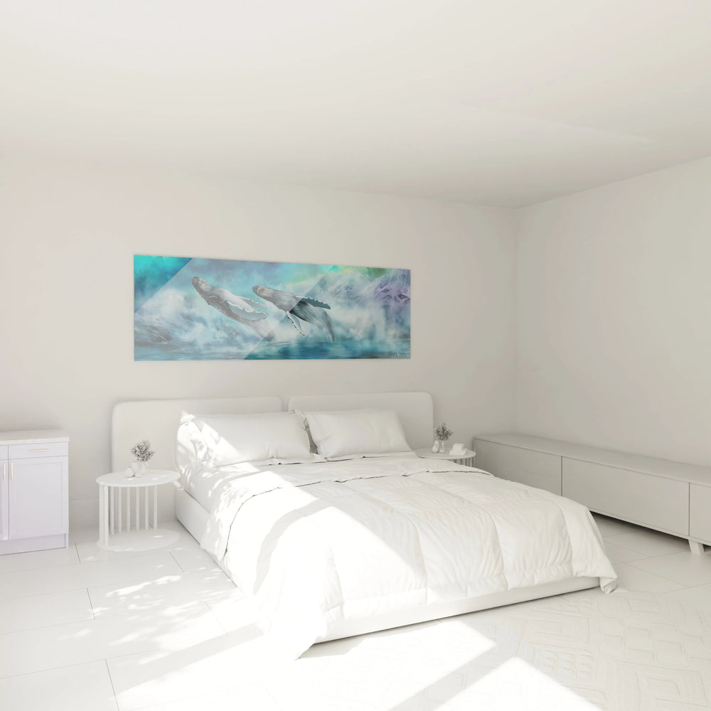 Ce tableau baleine présente une scène marine exceptionnelle mettant en vedette deux baleines à bosse majestueuses évoluant dans un environnement aquatique féerique. L'œuvre capture un moment de grâce pure où ces géants des océans semblent danser dans un décor de brumes bleutées et de nuages vaporeux. Le tableau baleine mystique révèle immédiatement sa singularité par son traitement atmosphérique remarquable et sa palette chromatique apaisante. Cette décoration murale baleine transforme instantanément l'espace par sa dimension panoramique et son impact visuel saisissant, créant une fenêtre vers un monde sous-marin enchanteur.