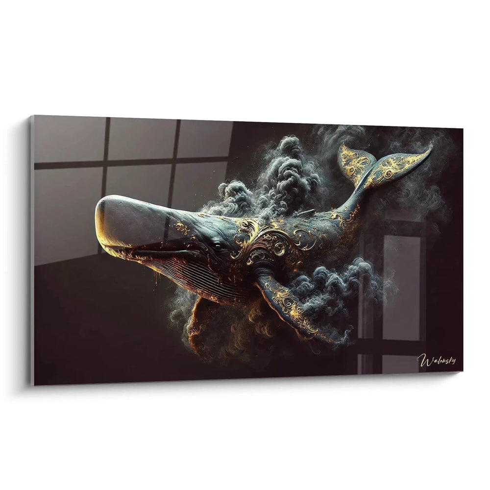 Imaginez ce géant des mers, immense et serein, flottant parmi des nuages vaporeux qui effleurent sa peau d’un bleu marine profond. Des arabesques dorées dansent délicatement sur son corps, apportant une lumière subtile qui sublime chaque ligne, chaque contour. Ce contraste entre les teintes sombres et les éclats dorés révèle une dualité fascinante, celle d’un animal sauvage enveloppé d’une aura presque mystique.