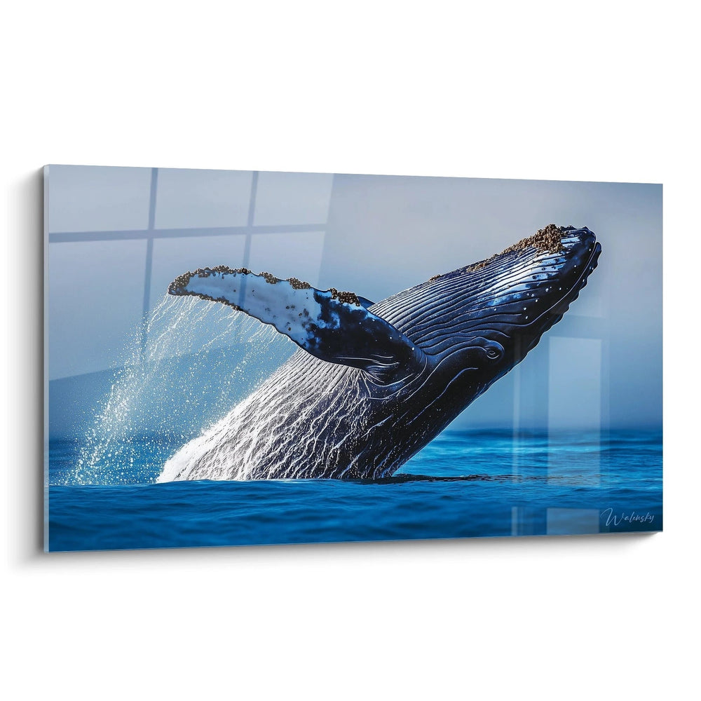 Cette œuvre d'art marine capture un moment extraordinaire : une majestueuse baleine à bosse jaillissant des eaux bleues dans un élan de pure liberté. Le tableau baleine présente un mammifère géant en plein saut, créant une gerbe d'eau cristalline qui scintille dans la lumière. Cette décoration murale baleine spectaculaire révèle immédiatement sa force dramatique par la position dynamique du cétacé et l'explosion d'écume qui l'accompagne. L'animal occupe une position centrale, légèrement décentrée vers la droite, créant un mouvement ascendant qui guide naturellement le regard. Les détails anatomiques de la baleine sont remarquablement précis, des sillons ventraux caractéristiques aux nageoires pectorales élancées.