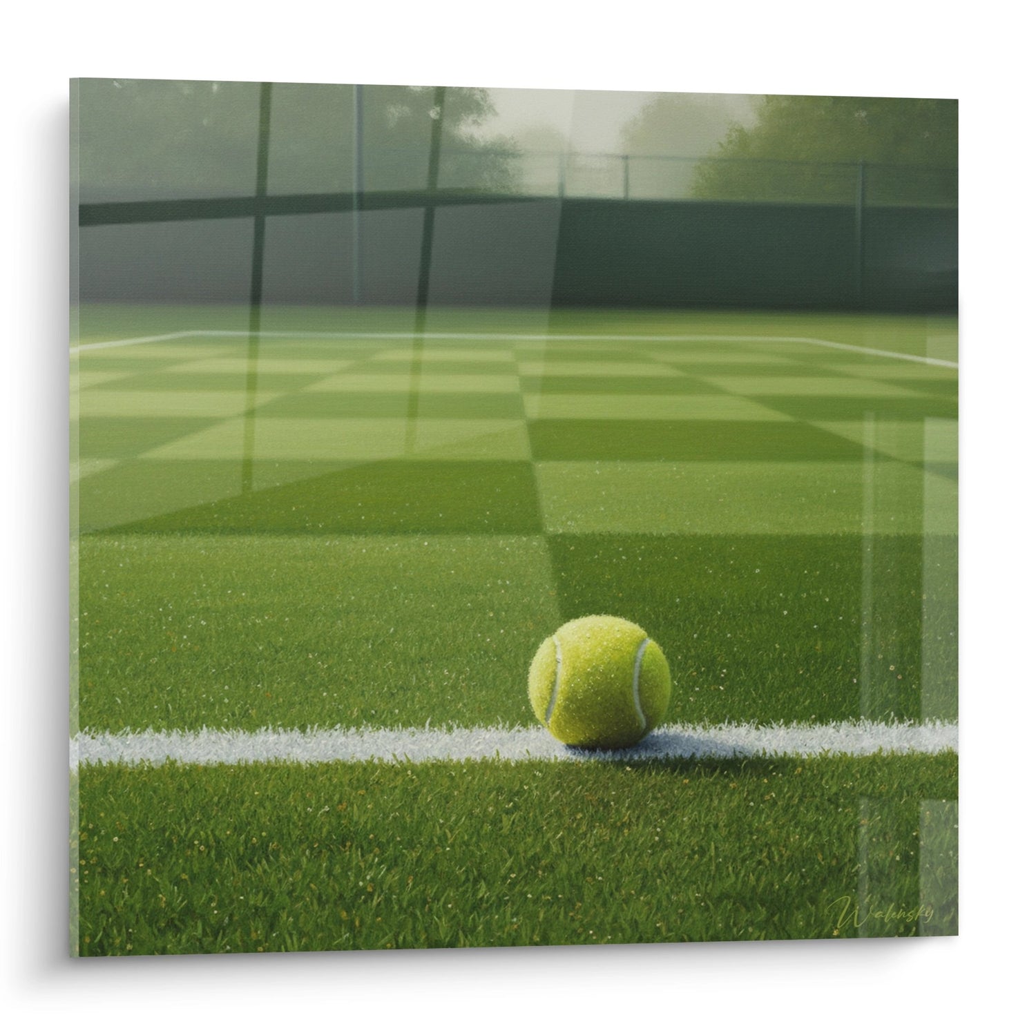 Cette œuvre d'art captivante immortalise un moment suspendu sur un court de tennis, où une balle jaune iconique repose délicatement sur la ligne blanche du terrain. Le tableau présente une perspective unique qui plonge le spectateur au cœur de l'action tennistique. La surface du court, représentée avec un réalisme saisissant, arbore cette teinte verte caractéristique des courts en dur professionnels. Les lignes blanches parfaitement tracées créent une géométrie pure qui guide naturellement le regard vers la balle, véritable protagoniste de cette composition. L'arrière-plan révèle les structures typiques d'un complexe tennistique avec ses filets et ses délimitations, plongeant ainsi l'observateur dans l'atmosphère authentique d'un club de tennis. Cette représentation artistique capture l'essence même du tennis, ce sport élégant où chaque point compte et où la précision règne en maître.
