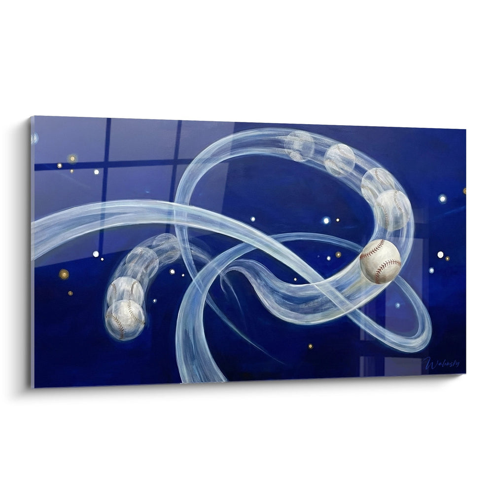 Cette œuvre d'art murale exceptionnelle capture l'essence magique du baseball à travers une vision cosmique saisissante. Deux balles de baseball semblent danser dans l'espace, reliées par des trajectoires lumineuses translucides qui évoquent les courbes parfaites des lancers légendaires. Le fond bleu profond, parsemé d'étoiles scintillantes, transforme ce sport américain emblématique en une expérience visuelle transcendante. Les rubans de lumière ondulent gracieusement, créant un mouvement perpétuel qui symbolise l'énergie et la passion du baseball. Cette représentation artistique unique élève le sport au rang d'art, où chaque lancer devient une chorégraphie céleste. Les balles, fidèlement reproduites avec leurs coutures caractéristiques, flottent avec élégance dans cet univers onirique, rappelant les moments suspendus d'un match parfait.
