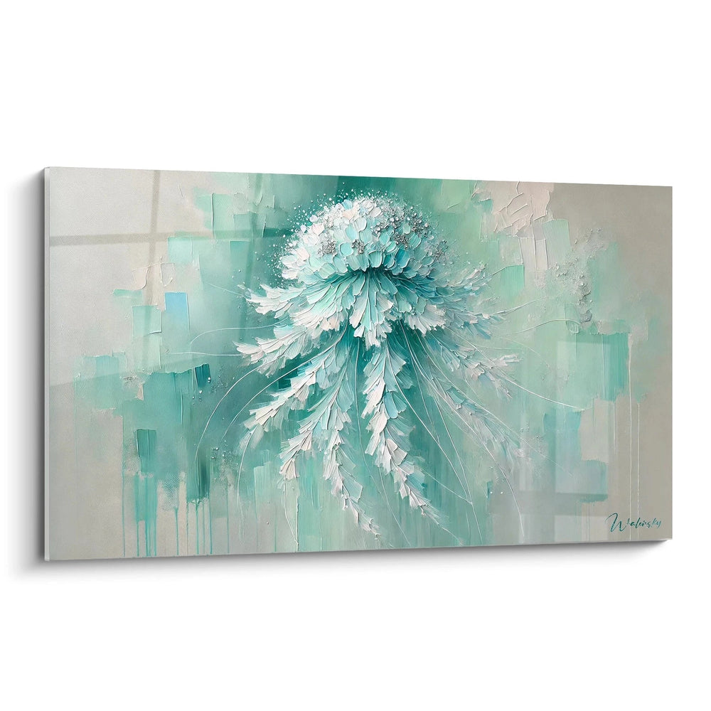 Imaginez la douceur caressante des eaux profondes, la légèreté suspendue du corps translucide de la méduse qui flotte infiniment. Le ballet lent et fluide de ses tentacules crée une sensation de flottement et d’apaisement, comme si le temps s’effaçait pour laisser place à une méditation visuelle. Le choix des teintes bleu, vert et blanc instaure une atmosphère d'une pureté et d’un calme reposants, évoquant ces rivages immaculés où règne la paix marine.