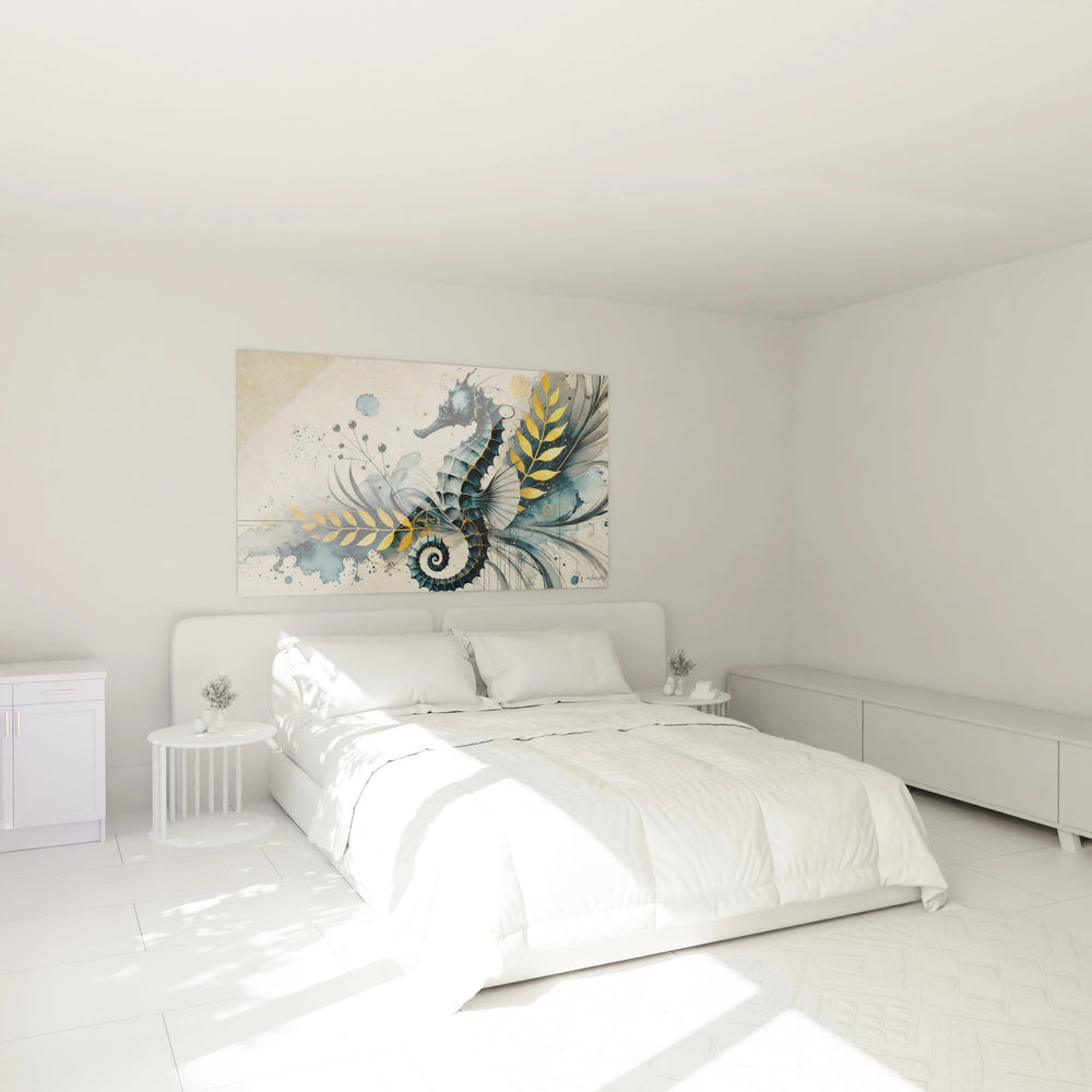 Chaque regard posé sur cette scène sous-marine est une invitation à quitter le tumulte du quotidien et à se laisser porter par une sensation de calme profond, où l’hippocampe devient symbole de protection et de chance, un talisman précieux pour votre intérieur.