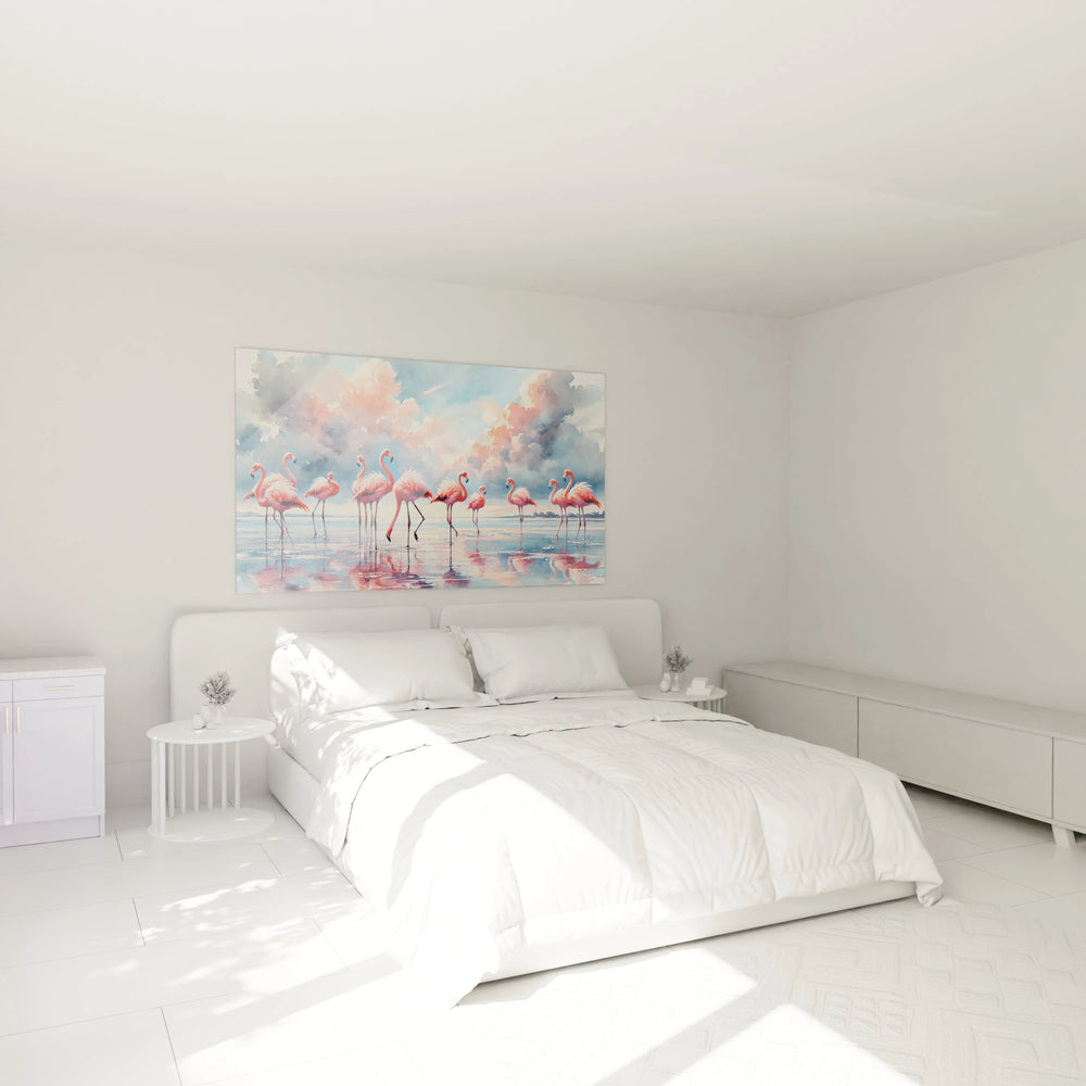 Cette œuvre vous invite à ressentir la quiétude d’un matin d’été où les couleurs pastel fusionnent en une symphonie harmonieuse de rose, bleu et orange. Chaque regard posé sur le tableau révèle les nuances changeantes d’un ciel qui se mêle subtilement aux reflets scintillants de l’eau, créant une atmosphère enveloppante et méditative. La grâce aérienne de ces flamants, silhouette élancée et posture délicate, apaise l’esprit et ouvre une fenêtre sur la beauté fragile de la nature.