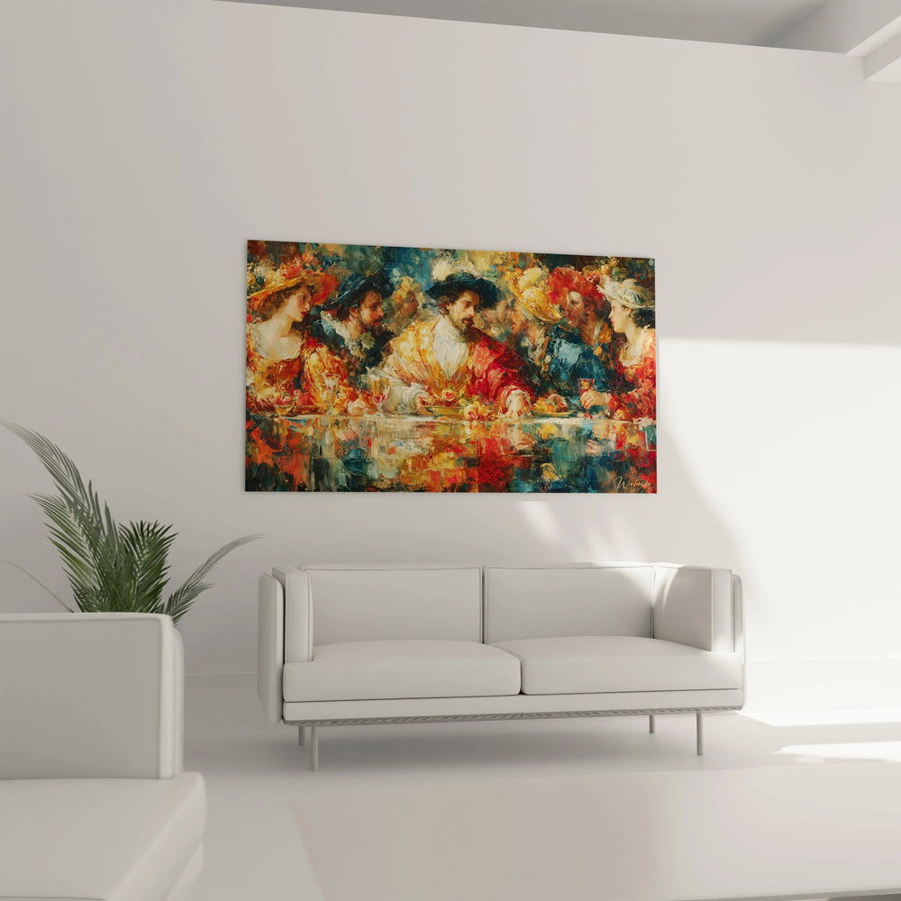 Ce tableau banquet renaissance présente une scène de festivités aristocratiques d'une richesse visuelle exceptionnelle. L'œuvre capture l'essence d'un repas festif où six personnages en costumes d'époque se réunissent autour d'une table garnie. Le tableau banquet convives joyeux déploie une palette chromatique flamboyante dominée par les rouges écarlates, les ors lumineux et les bleus profonds. Cette décoration murale banquet impressionne immédiatement par sa technique picturale généreuse et ses empâtements expressifs qui confèrent une texture riche à l'ensemble de la composition.