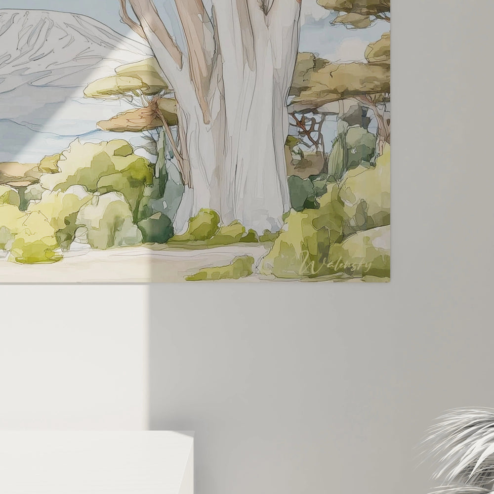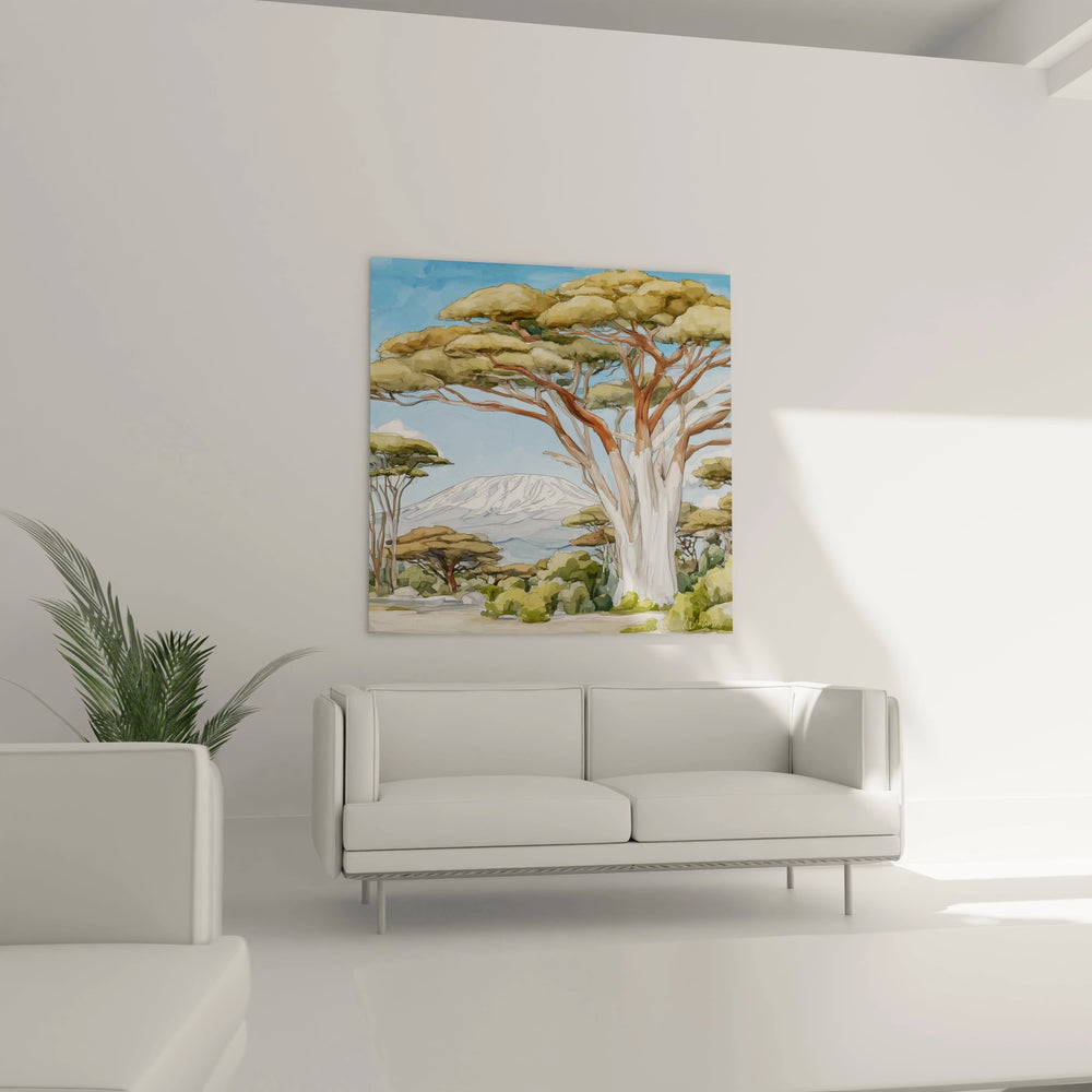 Cette art mural baobab se distingue par plusieurs éléments visuels remarquables qui en font une œuvre unique. La représentation du baobab avec ses multiples troncs blancs fusionnés constitue une caractéristique botanique fidèlement rendue, rare dans l'art décoratif. La juxtaposition du géant végétal avec le mont Kilimandjaro crée une composition géographiquement cohérente et émotionnellement forte. Le traitement des nuages, avec leurs formes arrondies et leurs volumes généreux, apporte une dimension atmosphérique particulière à cette décoration murale Kilimandjaro. L'équilibre entre réalisme et stylisation confère à l'ensemble une identité visuelle distinctive, ni trop documentaire ni trop abstraite.