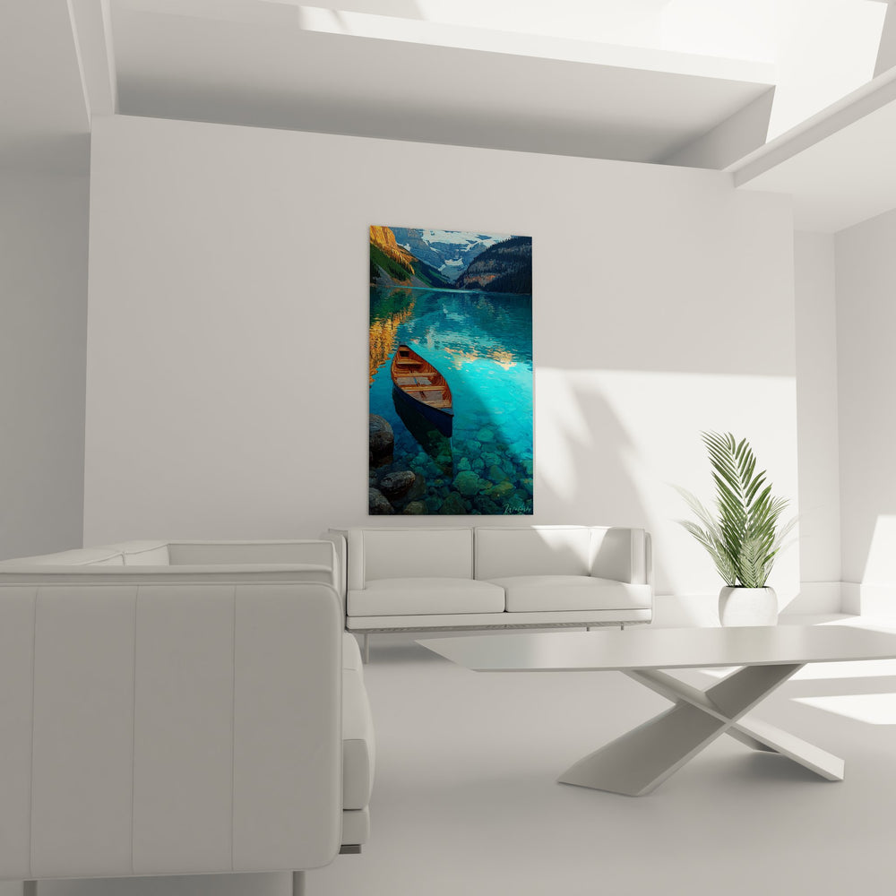 Tags : barque lac montagne, tableau eau cristalline, peinture alpine, décoration lac, art paysage