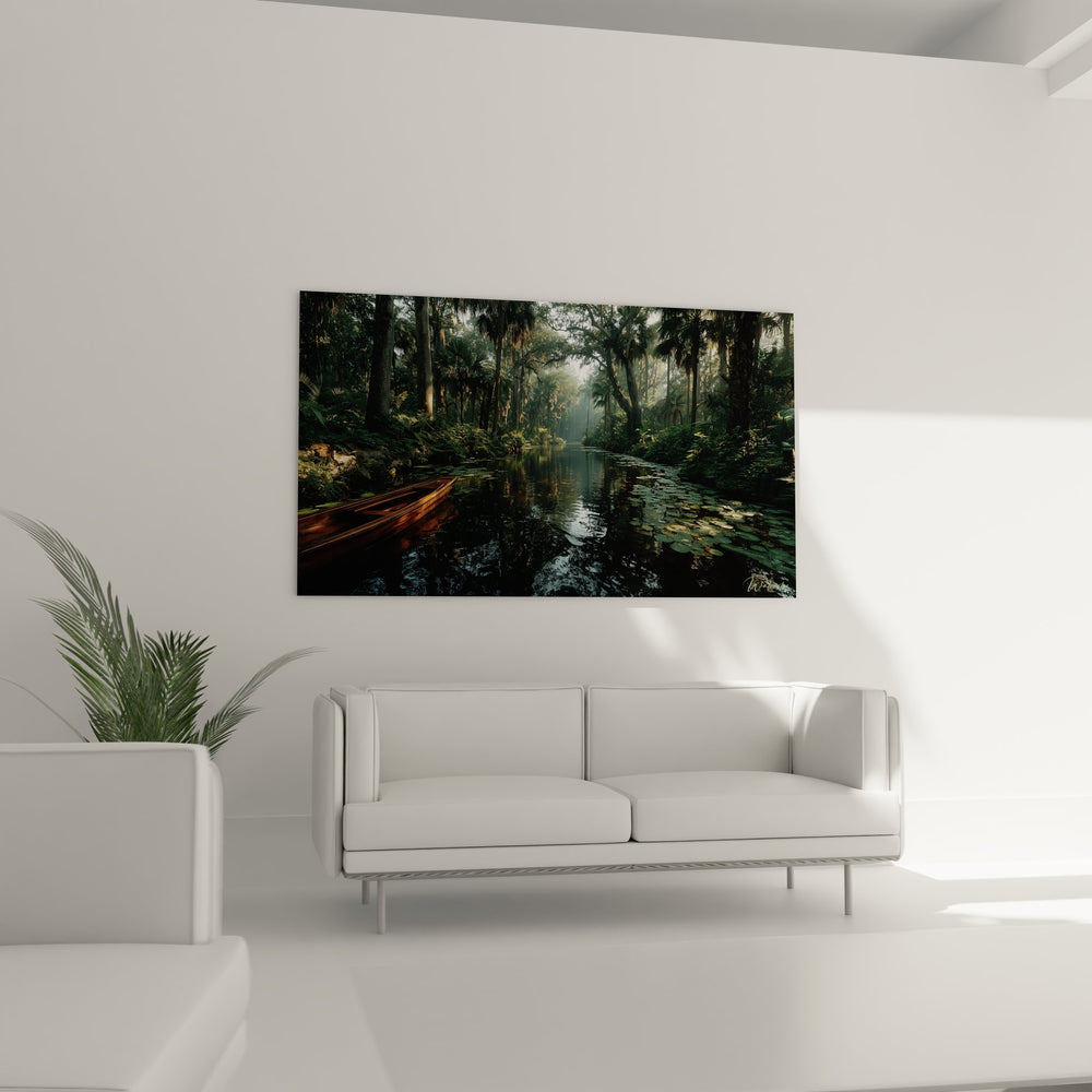 Ce tableau mural barque tropicale capture la beauté mystique d'une forêt tropicale luxuriante traversée par une rivière calme. L'embarcation en bois, finement détaillée, flotte paisiblement sur les eaux sombres et réfléchissantes, créant un point focal saisissant dans cette composition naturelle. Les palmiers tropicaux se dressent majestueusement de chaque côté du cours d'eau, leurs frondes se balançant doucement dans la lumière filtrée. Cette décoration murale nature révèle un écosystème préservé où la végétation dense crée un sanctuaire de tranquillité. Les rayons de soleil percent subtilement la canopée, illuminant la scène d'une lumière dorée et créant des jeux d'ombres fascinants sur la surface de l'eau. Ce tableau forêt tropicale évoque l'atmosphère envoûtante des backwaters, ces canaux naturels bordés d'une végétation exubérante. La composition équilibrée entre les éléments aquatiques et terrestres offre une ambiance jungle sereine parfaite pour transformer n'importe quel espace intérieur. L'artiste a su capturer l'essence même de ces paysages tropicaux préservés, où le temps semble suspendu et où la nature règne en maître absolu.